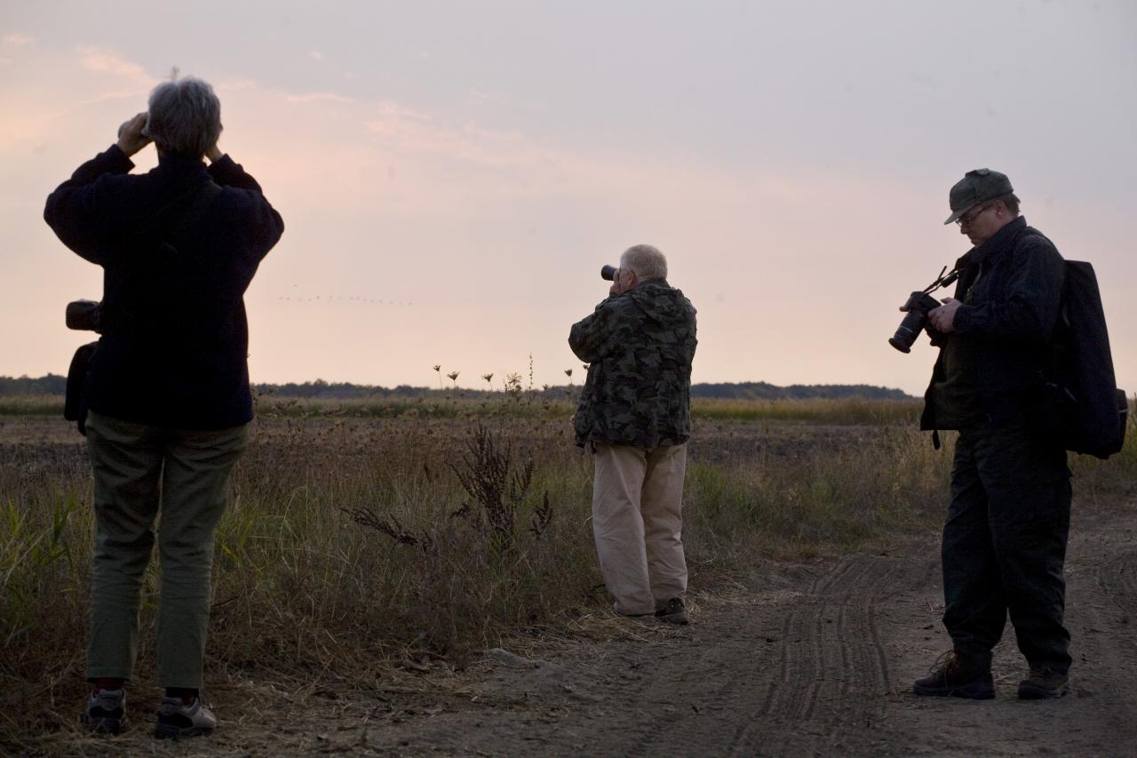 asi po dvadsiatich kilometroch od mestečka Tiszafüred, kde sme ubytovaní v kempingu, zastavuje autobus na okraji kukuričného poľa. „Zúfalá, depresívna rovina,“ chcelo by sa zvolať. Sándor Petöfi písal poetickejšie o krajine rovnej ako hladina mora. Z autobusu sa trúsia po prašnej ceste dva tucty postáv: niektoré s výkonnými monokulármi na statívoch, ktoré priblížia pozorovanú realitu až 80-násobne, iné s klasickými binokulármi, ďalšie iba s voľným okom a kompaktnými foťáčikmi. No všetci – aj 11-ročný Samko, ktorý si celú cestu v autobuse listuje Veľký atlas živočíchov a ustavične sa pýta mamy, ktorá vie toho o faune zjavne menej ako on – sem prišli s rovnakým cieľom. Byť pri tom, keď ponad hlavy prelietajú podvečer kŕdle vtákov, ktoré mnohí starší poznajú iba z legendárneho vojnového filmu Žeriavy tiahnu. „Pozri, ako sa to ladne pohybuje po oblohe,“ vraví jeden. „Počujete to pískanie? To sú mladé vtáky, juvenily,“ dodá druhý. Okolo prechádza traktor s vlečkou a víri prach.