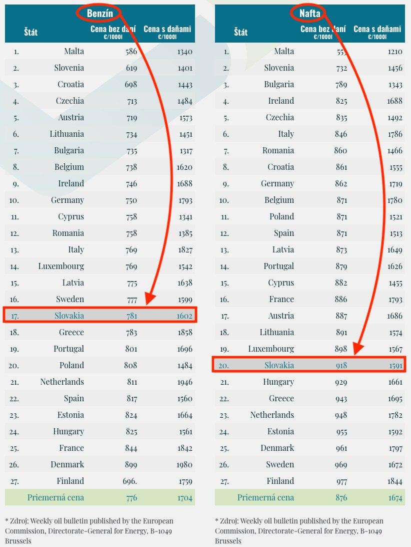 Cena benzínu bez daní (DPH, spotrebné dane) je na Slovensku z Európskej dvadsaťsedmičky medzi tými vyššími, na Rakúsko a Čechy nemáme: tam je cena nižšie, aj výrazne. U nafty rovnako.