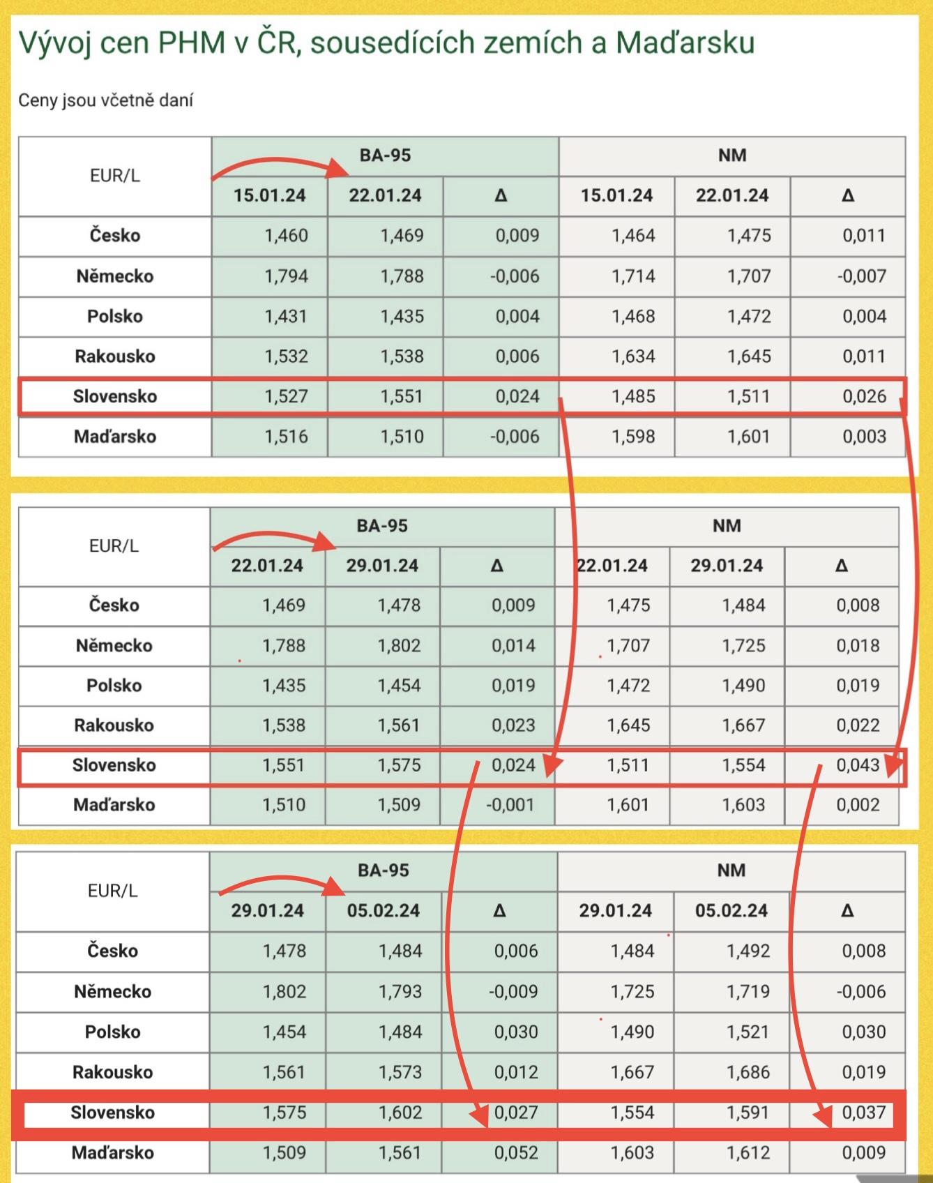 už v strede januára boli ceny benzínu na Slovensku z okolitých krajín (okrem Rakúska) najvyššie. Následne pri prvom zvýšení do 22. januára sme preskočili aj Rakúsko a v ďalších dvoch skokoch sme sa dostali o slušných 12 centov vyššie ako Rakúsko, Poľsko, Maďarsko alebo Česko.
