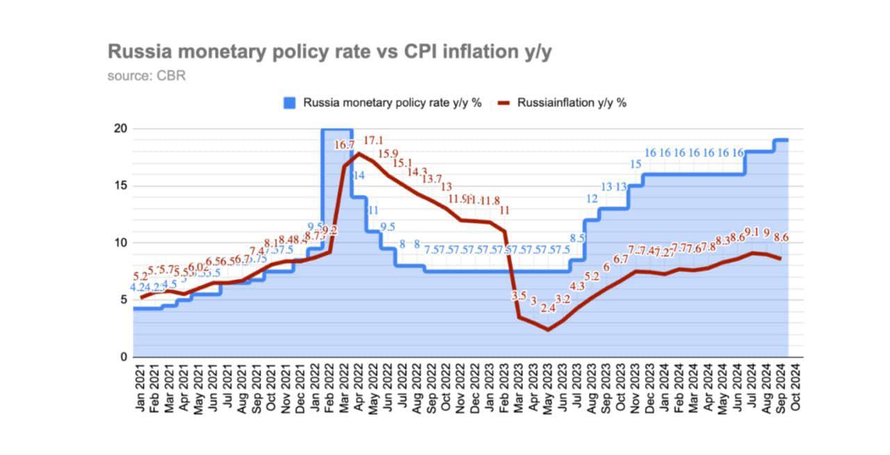 Pozrime sa na úrokové miery a hlásenú infláciu z Ruska: viď druhý graf. Inflácia polovičná oproti 2022?