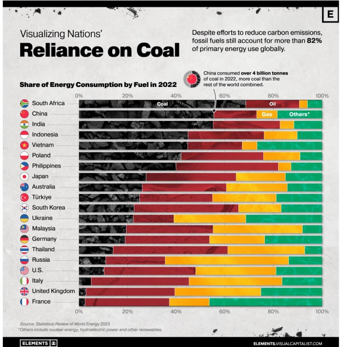 Vyššie uvedený graf používa údaje zo štatistického prehľadu svetovej energetiky, aby ukázal, do akej miery sa vybrané krajiny spoliehajú na fosílne palivá, najmä uhlie.
