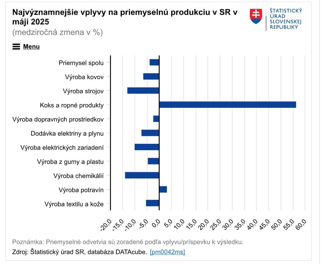 Najvýznamnejšie výsledok ovplyvňoval 9 % rast vo výrobe dopravných prostriedkov (príspevok +2,24 p. b.). Po zhierarchizovaní do rebríčka vplyvov na výsledok priemyslu v kumulatíve od začiatku roka 2025 boli na nasledujúcich až piatich miestach odvetvia, ktoré ťahali priemysel do mínusu.