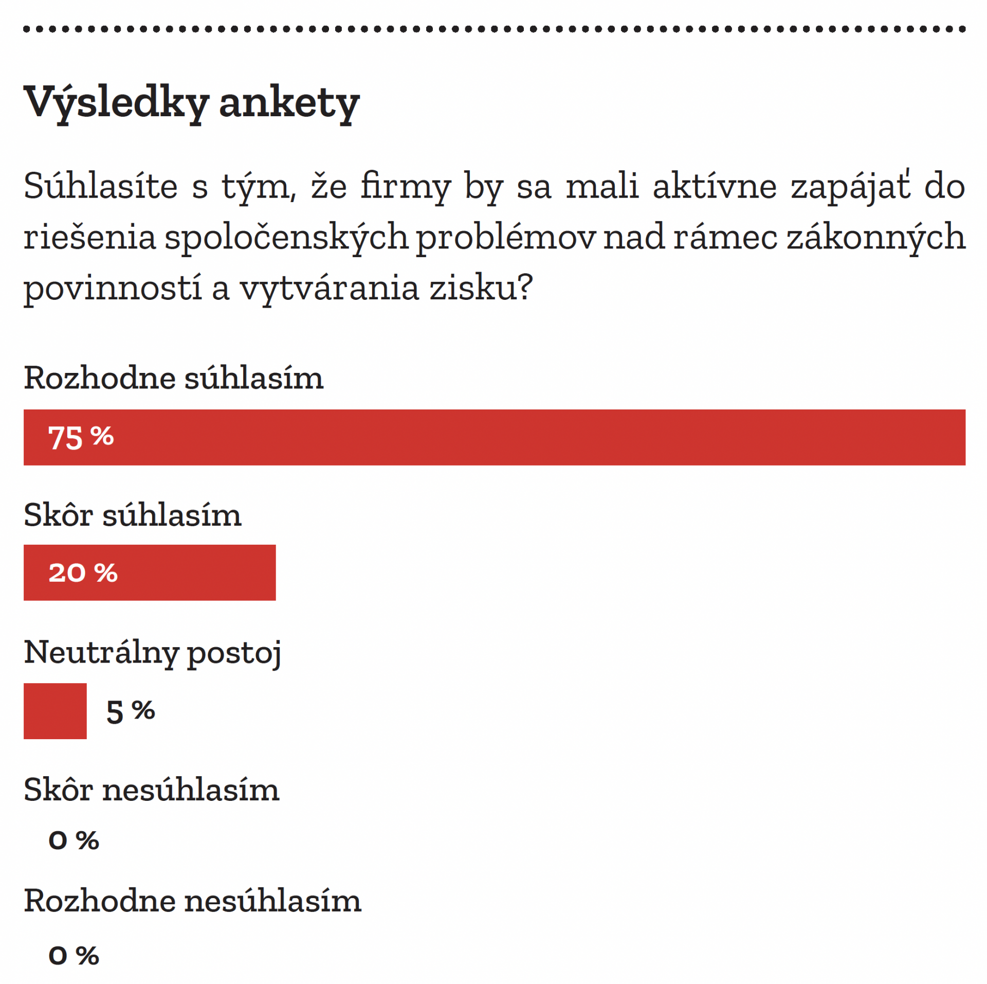 Verejnosť dnes oprávnene očakáva, že firmy budú aktívne prispievať k riešeniu spoločenských výziev. A firmy k tejto úlohe pristupujú zodpovedne – svoju angažovanosť potvrdili napríklad pri vypuknutí vojny na Ukrajine aj nedávno pri výročí Dňa boja za slobodu a demokraciu, keď sa jednoznačne postavili za demokratické hodnoty. Firmy zároveň pravidelne pomáhajú finančne, materiálne aj dobrovoľnícky.