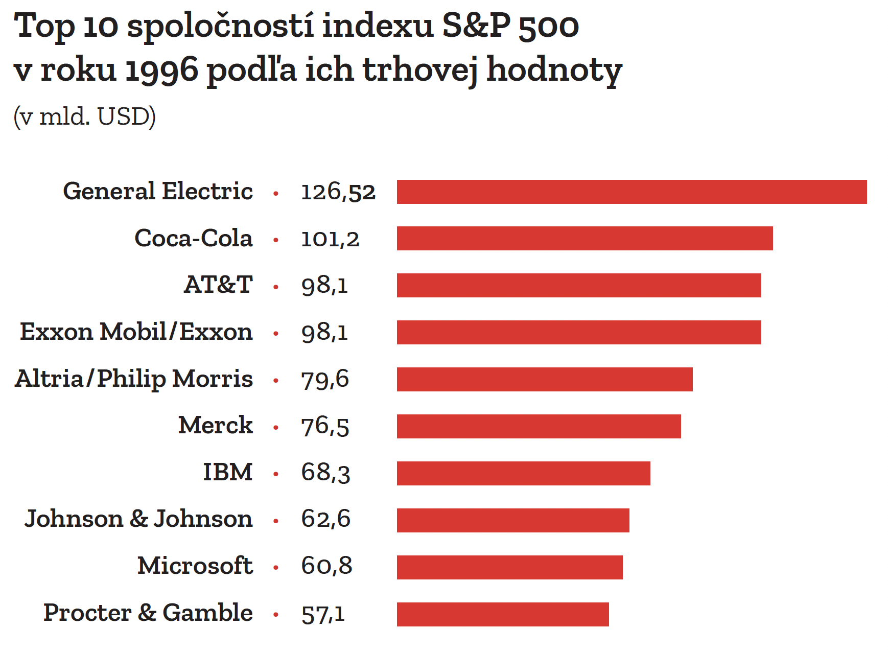 V polovici 80. rokov tvorilo desať najväčších spoločností v indexe S&P 500 len okolo 20 % jeho celkovej trhovej hodnoty. Indexu dominovali firmy z energetiky, priemyslu a tradičných konglomerátov ako IBM, Exxon, General Electric, AT&T či General Motors, keďže americká ekonomika bola vtedy postavená predovšetkým na výrobe, ťažbe a priemyselnej expanzii. Za posledných tridsať rokov sa v pôvodnej desiatke udržal medzi najväčšími titulmi len Microsoft.