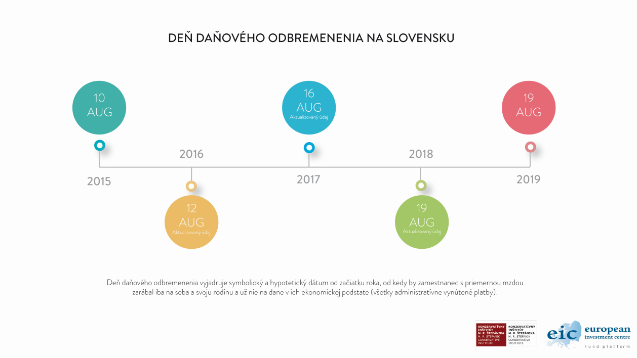 tento rok prestávame pracovať pre štát a začíname zarábať na seba práve 19. augusta. Zamestnanec s priemernou mzdou pracoval na zaplatenie všetkých daní a odvodov viac ako 228 dní. Deň daňového odbremenenia je identický, ako bol vlani.