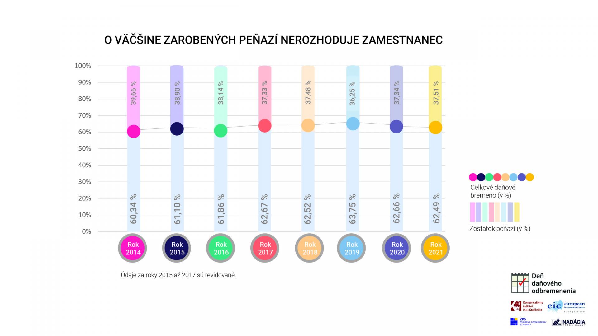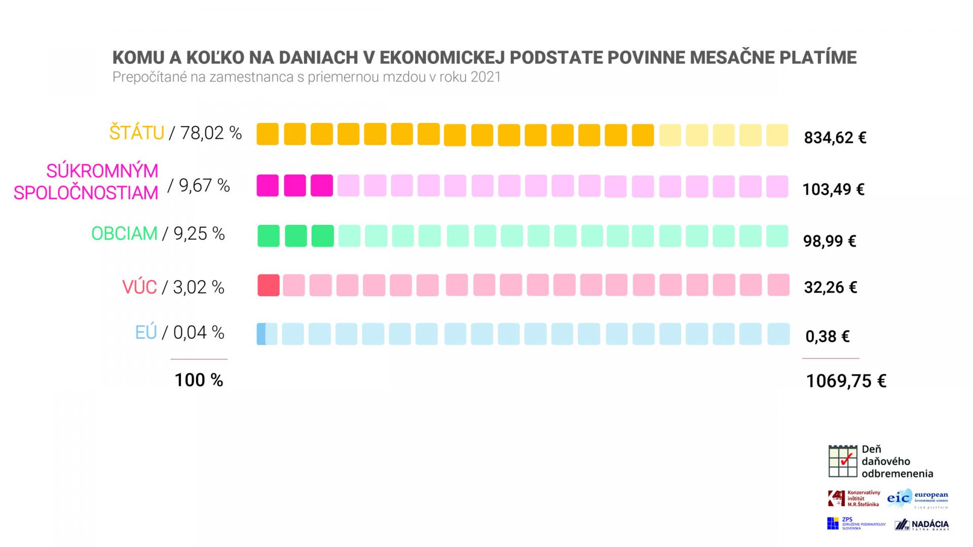 Zamestnanec s priemernou hrubou mzdou 1211 eur na mesiac a s celkovou odmenou, ktorá mu patrí (mzdovými nákladmi, resp. superhrubou mzdou) vo výške 1712 eur, znášal v minulom roku bremeno všetkých daní v ekonomickom chápaní administratívne vynútených platieb v objeme necelých 1070 eur na mesiac. Takmer o dvoch tretinách jeho celkovej odmeny tak za neho rozhodovali zástupcovia verejnej moci. Zodpovedá to aj podielu z potenciálneho celkového množstva tovarov a služieb, ktoré si zamestnanec kvôli daniam nemohol dovoliť. Len zostatok peňazí v sume 642 eur mesačne (37,51 % mzdových nákladov) predstavuje trhovú nezdanenú hodnotu tovarov a služieb, ktoré mohol zamestnanec s priemernou mzdou za mesiac kúpiť.