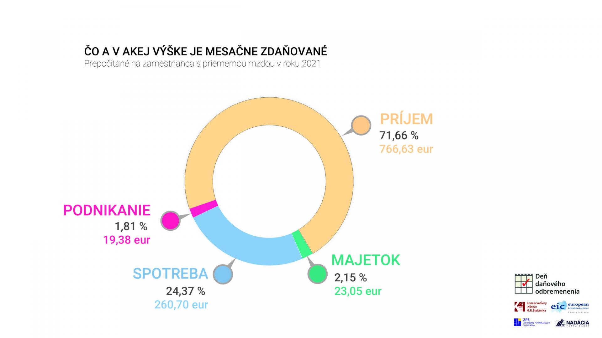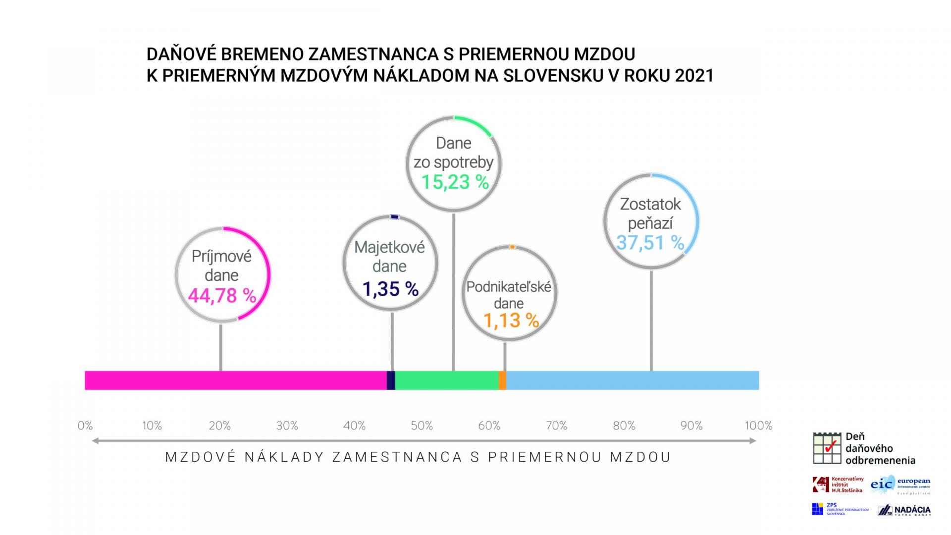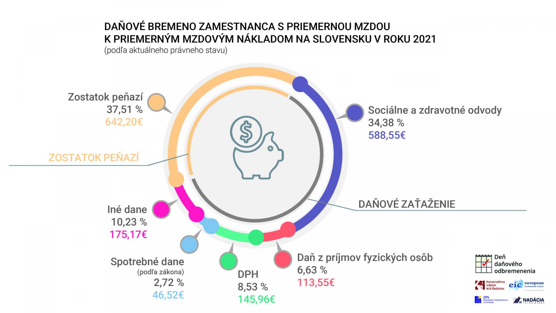V kontexte členenia povinných platieb podľa súčasného právneho stavu predstavovali aj v roku 2021 najväčšie bremeno sociálne a zdravotné odvody. Tvorili necelých 34,4 % mzdových nákladov priemerného zamestnanca. Prezident Združenia podnikateľov Slovenska Ján Solík zároveň pripomína: „Práve sociálne a zdravotné odvody predstavujú oblasť, ktorá dlhodobo dominuje v rebríčkoch problémov v podnikateľskom prostredí aj medzinárodných porovnaniach. Napriek tomu, že sa vláda vo svojom programe zaviazala vytvoriť predpoklady pre zastavenie rastu daňovo-odvodového zaťaženia, predkladané návrhy zákonov idú často opačným smerom a ešte zvyšujú už beztak vysoké odvodové zaťaženie.“ Okrem sociálnych a zdravotných odvodov odkrojili z celkovej odmeny patriacej zamestnancovi s priemernou mzdou ďalšie povinné platby nasledovne: DPH 8,5 %, daň z príjmov fyzických osôb 6,6 %, spotrebné dane podľa zákona 2,7 % a iné dane necelých 10,2 %. Zostatok peňazí zodpovedal spomínaným 37,5 % mzdových nákladov (pozri graf).