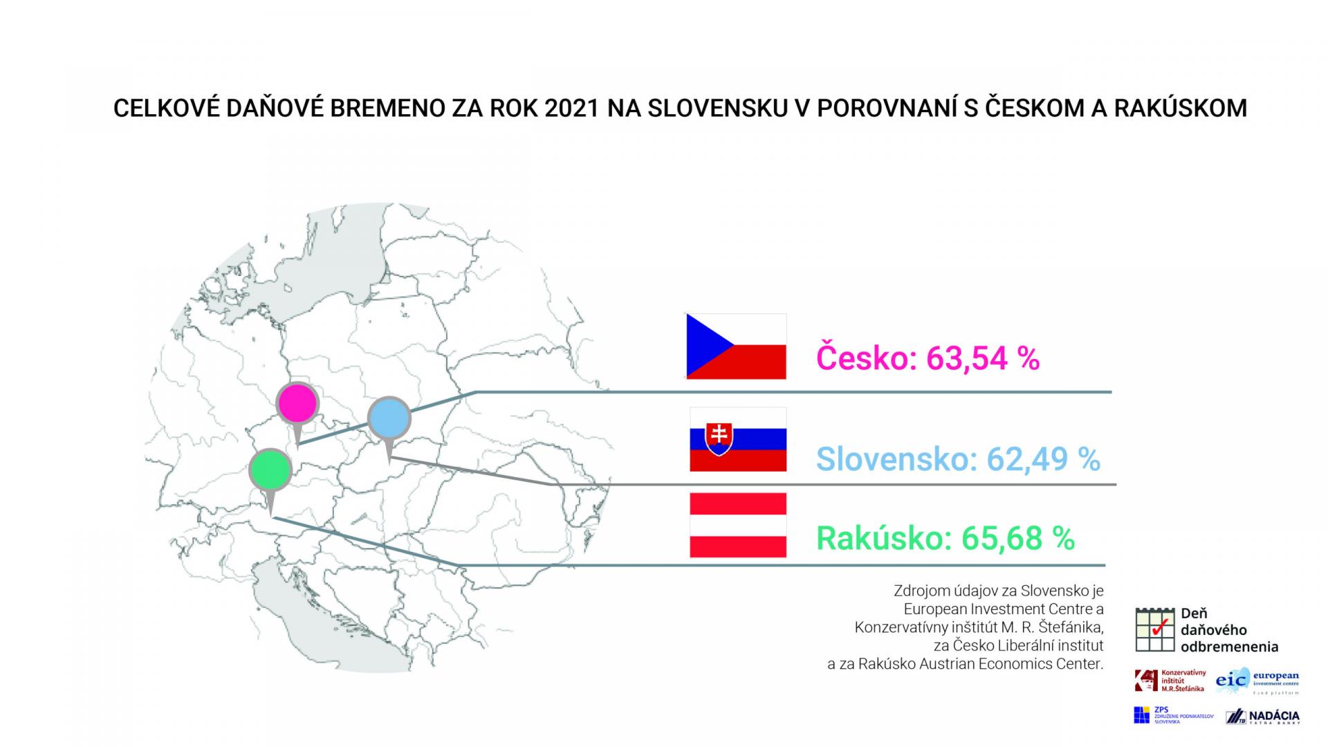 Takéto celkové bremeno daní ako administratívne vynútených platieb dosiahlo v roku 2021 podľa týchto prepočtov 62,49 % k mzdovým nákladom na zamestnanca s priemernou mzdou, zatiaľ čo zostatok peňazí, o ktorom rozhodujeme sami, predstavoval v prepočte na takéhoto zamestnanca iba 37,51 % (viac v prílohe tlačovej správy). Ešte o niečo vyššie bolo celkové daňové bremeno v minulom roku u našich západných a juhozápadných susedov. Podľa rovnakej metodiky dosiahlo v Česku 63,54 % a v Rakúsku až 65,68 %.