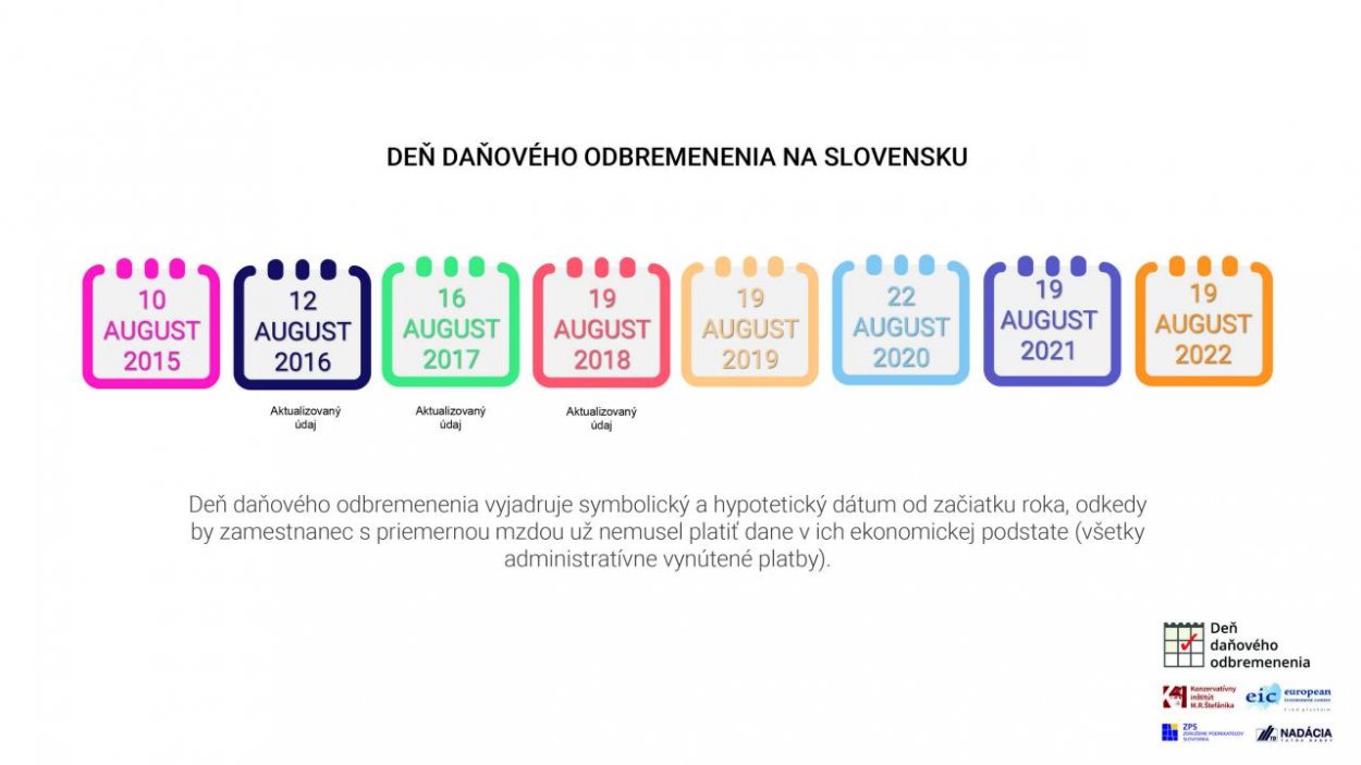 celkové bremeno daní ako administratívne vynútených platieb je pritom také veľké, že zamestnanec s priemernou mzdou by potreboval vyše 228 dní na ich zaplatenie a až od 230-teho dňa by nemusel platiť nijaké povinné platby. Deň daňového odbremenenia na Slovensku preto v tomto roku hypoteticky pripadol rovnako ako v minulom roku na 19. augusta, čo je o 9 dní neskôr ako v roku 2015.