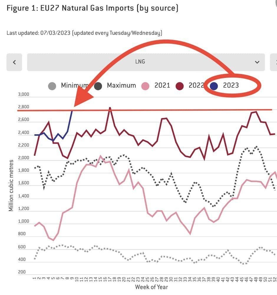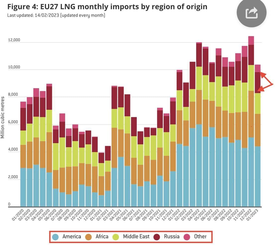 LNG sa dováža aj z Ruska. Graf nižšie ukazuje podiel ruského LNG na celkovom LNG importe do EÚ. V roku 2022 to bolo z Ruska celkovo 19 miliárd m3 a rast +35% oproti 14 miliardám m3 v roku 2021. Rast dovozu LNG z Ruska v januári 2023 bol medziročne +16% (1,552 vs. 1,338 miliardy m3) a bol mierne pod úrovňou mesačného priemeru v roku 2022 (1,6 milisrdy m3).