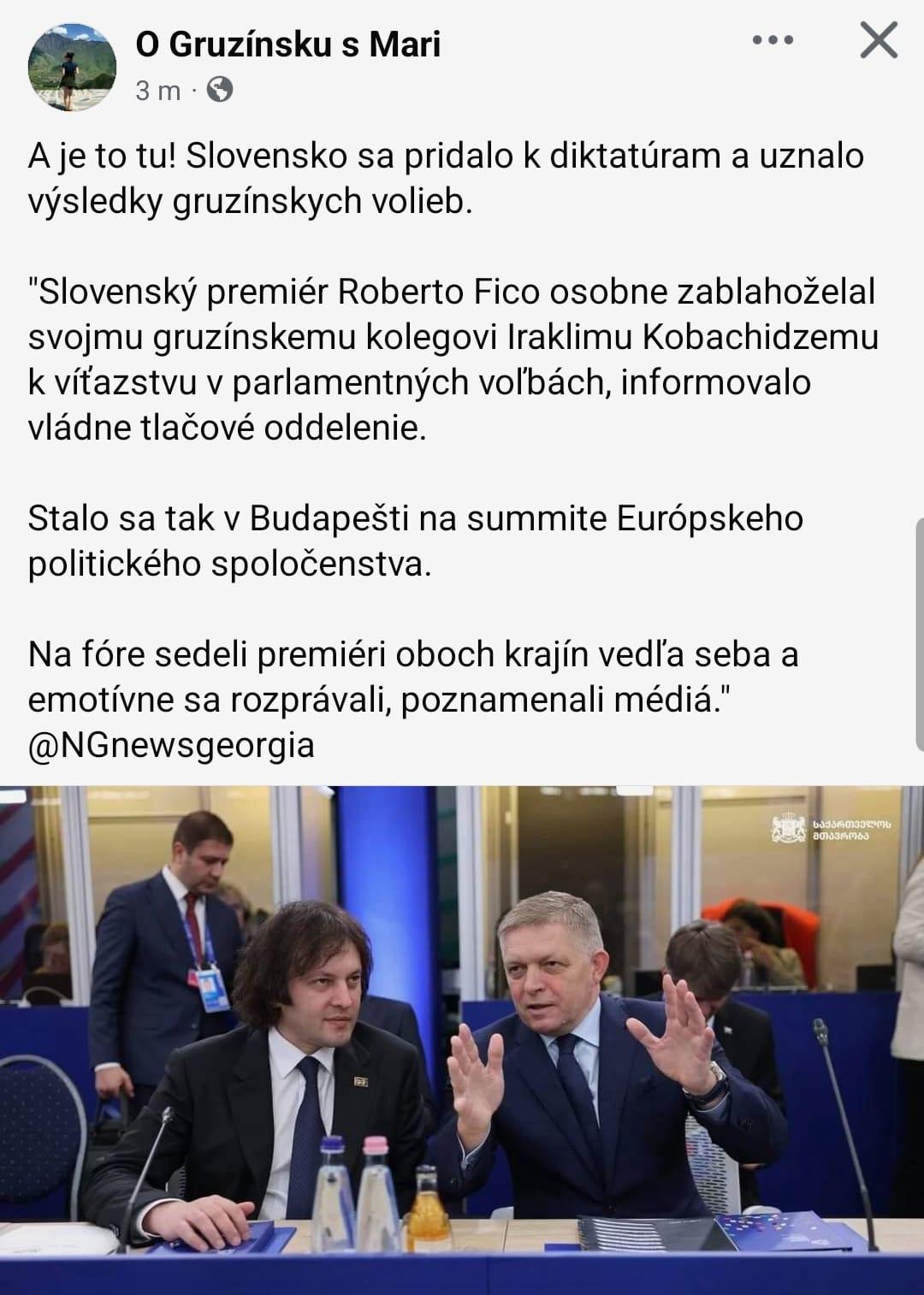 „zápas Gruzínska o svoju budúcnosť je zápasom o budúcnosť Európy ako aj o skutočnú podobu demokracie v 21. storočí. Odhodlanie a vôľa brániť demokratické a európske hodnoty je dnes, popri hrdinsky brániacej sa Ukrajine pred barbarskou agresiou Ruska, viac ako kdekoľvek inde stelesnená cez vás, v státisícoch gruzínskych občanov a občianok, ktorí sa nechcete zmieriť s únosom demokracie, ktorú ste si v nedávnych obdobiach ťažko a cez množstvo obetí vybojovali. Ste inšpiráciou a povzbudením pre celý svet. Pokusy o únos demokracie, narušovanie ústavnosti a vlády zákona sú bolesti aj u nás, na Slovensku. A aj preto sledujeme a preciťujeme vaše úsilie s veľkým napätím. Sme s vami, stojíme pri vás a prajeme vám nezlomnú výdrž, odhodlanie a energiu,“ uvádza sa vo vyhlásení, ktoré dnes signatári zaslali predstaviteľom demokratických síl v Gruzínsku.