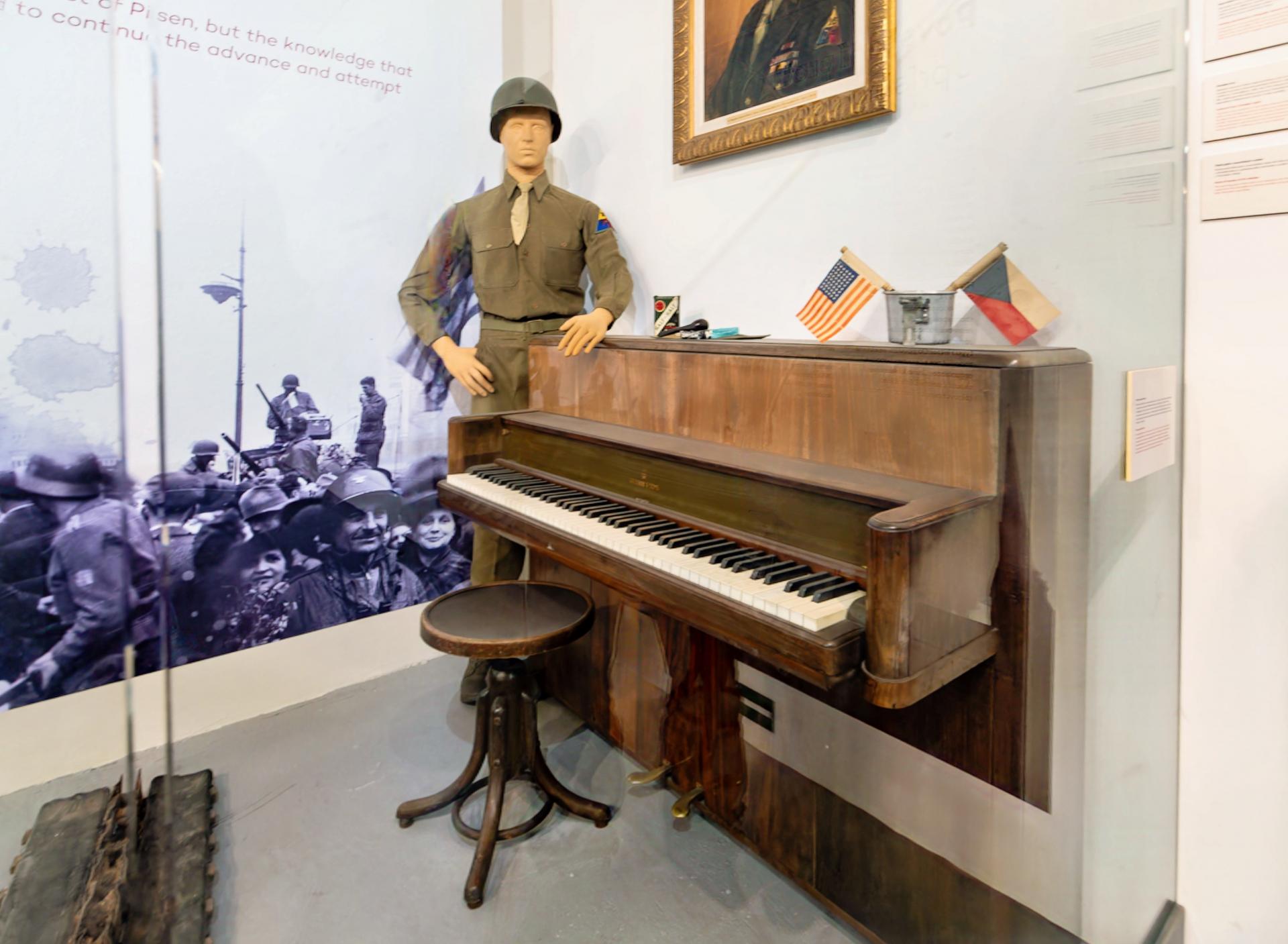 Po múzeu Patton Memorial Pilsen nás sprevádza kurátor a spoluzakladateľ, historik Ivan Rollinger, ktorý vie o oslobodení Plzne všetko a s láskou zhromažďuje veci, ktoré po Američanoch zostali, vrátane neotvorených fliaš kokakoly, plechoviek s práškovým mliekom, ale aj ostrohovým kolesom zo stíhačky. Zaujal ma klavír značky Steinway & Sons, ktorej nástroje dosiaľ patria medzi absolútnu svetovú špičku. Vo vojnových rokoch robili vodoodolné a podľa možnosti kompaktné klavíry aj pre armádu, pre pozemské vojsko olivovozelený, pre námorníctvo sivomodrý. Ten v expozícii múzea už, žiaľ, stratil svoj pôvodný náter, lebo jeho majiteľ, klavírny technik, pán Ježek, ho síce opravil, ale zobral to od podlahy.