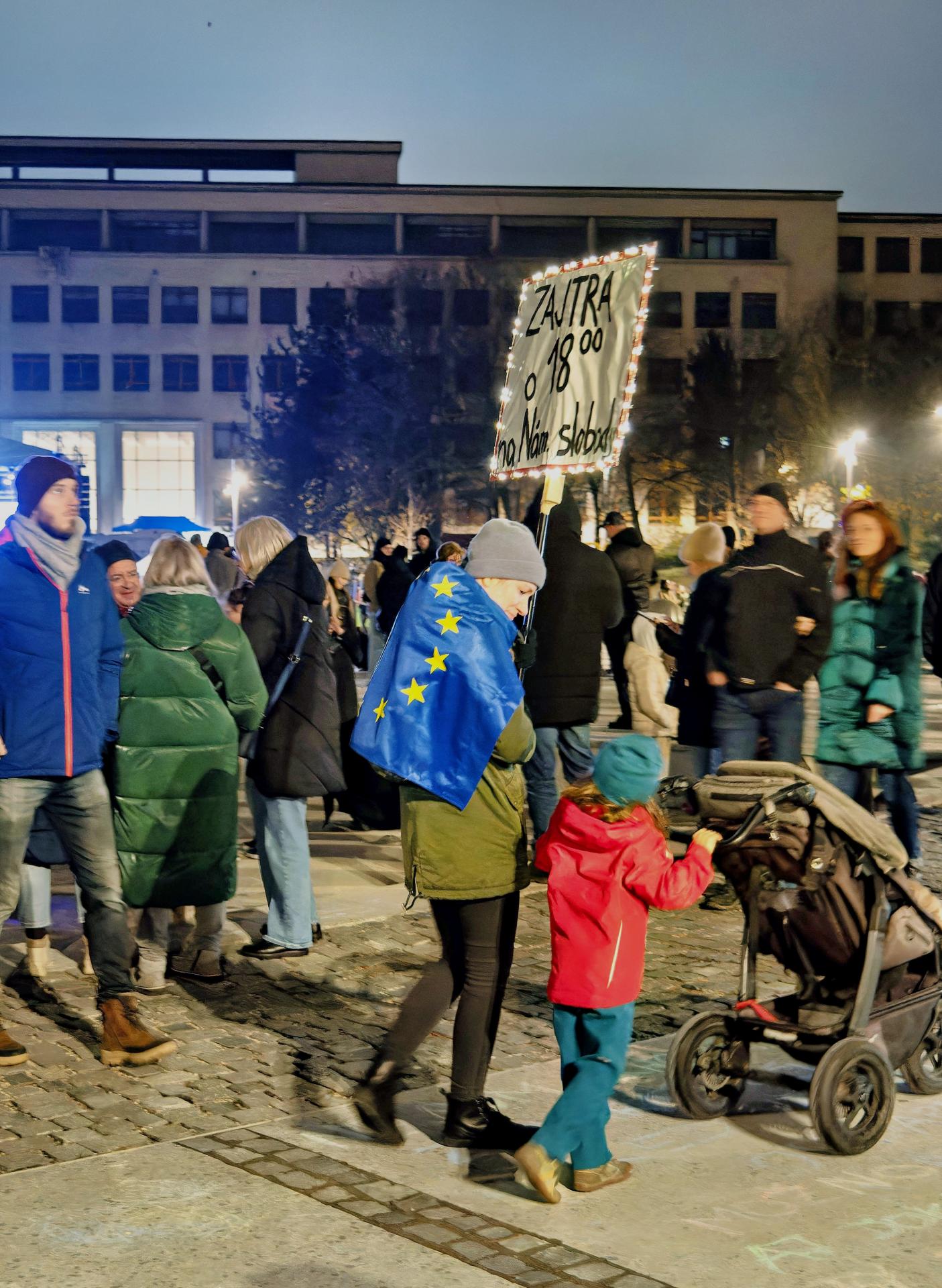 Na prvý pohľad tu bolo viac, oveľa viac mladých ľudí ako na minulých zhromaždeniach. To je sľubné. Trochu som sa obával, či sa sem nevotrú freepalestínci s vlajkami, ale jediná vlajka okrem slovenských a EÚ bol biely kôň na zelenom poli tolkienovského kráľovstva Rohan.