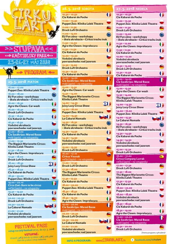 Celý Zámocký park ožije divadlom a cirkusom. Povrazochodec vysoko nad jazerom, najväčší marionetový cirkus sveta s nadrozmernými zvieracími bábkami, akrobati, divadelníci, kúzelníci, klauni, vzdušné konštrukcie, malé a veľké cirkusové šapitó s hlavným top programom, maringotky, bábkové divadlá, worshopy a tvorivé tréningové zóny, kde si malí a veľkí môžu vyskúšať rôzne cirkusové disciplíny a techniky. Skrátka, umelci a program od výmyslu sveta.