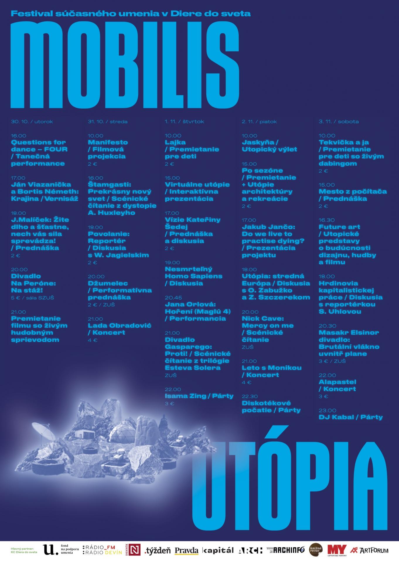 v Liptovskom Mikuláši sa od 30. októbra do 3. novembra uskutoční už piaty ročník multižánrového festivalu Mobilis, ktorého témou je „Utópia". Domáci aj zahraniční hostia sa v priestoroch Kultúrneho centra Diera do Sveta budú zaoberať otázkou nesmrteľnosti človeka, víziami architektúry, umenia a filmu budúcnosti, alebo či je stredná Európa utópiou.