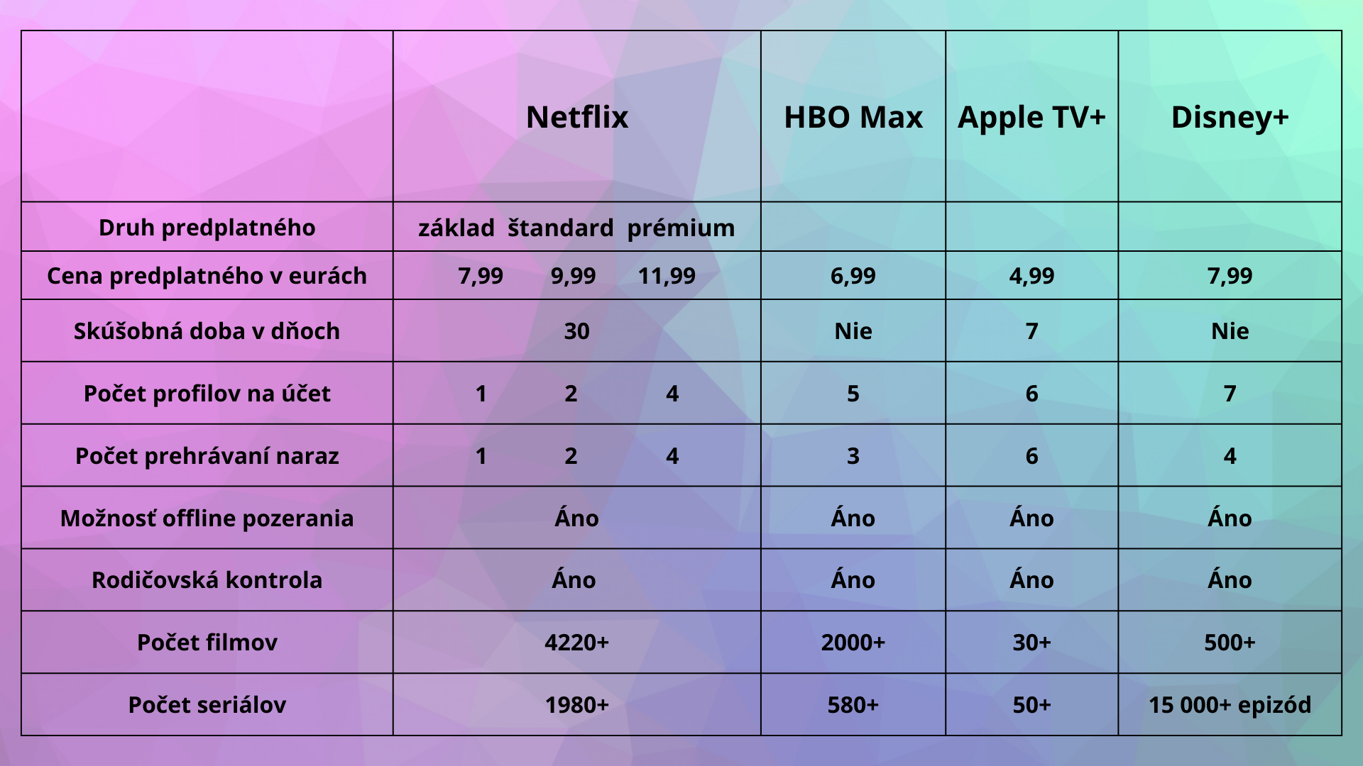 Ponuka streamovacích služieb je pestrá a zároveň plná odlišností. Všetky služby s výnimkou Netflixu ponúkajú jednotné predplatné, ktorého súčasťou je presne určený počet účtov, prostredníctvom ktorých sa dostanete k obsahu a na koľkých zariadeniach súčasne môžete mať spustené prehrávanie. Pri Netflixe sa to líši podľa druhu predplatného.