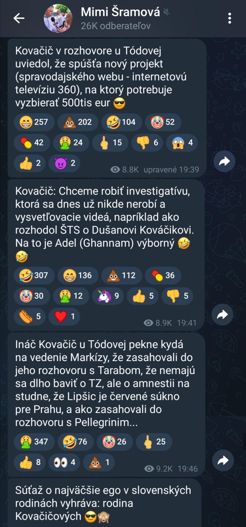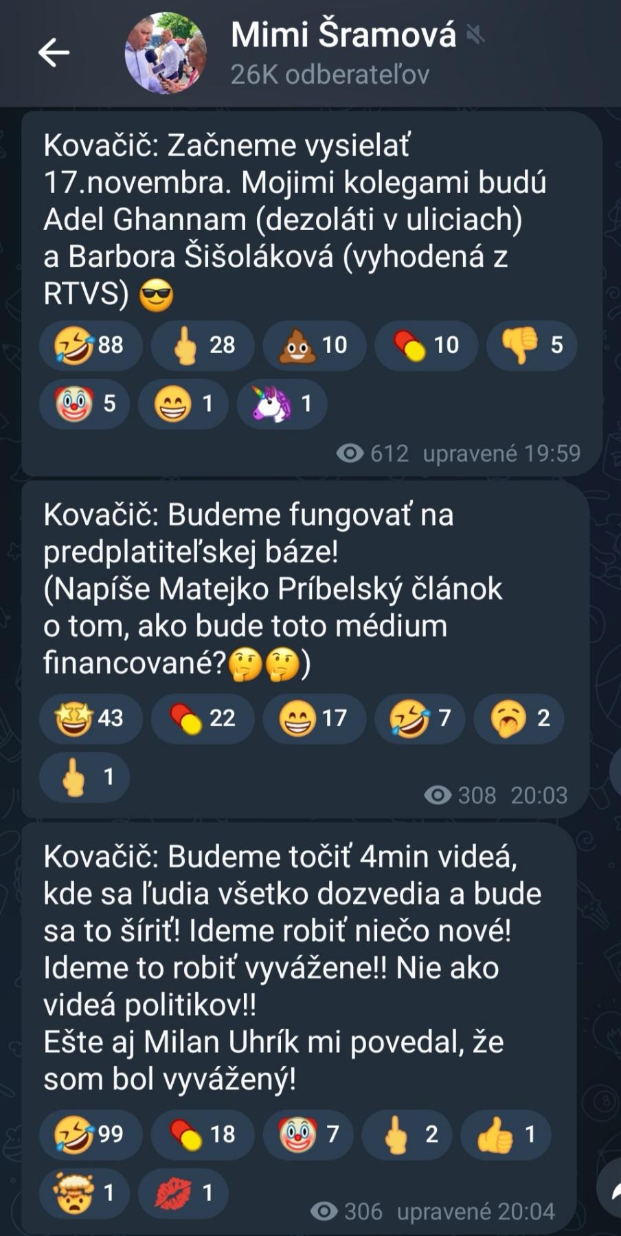možno vás to prekvapí, ale aj pre dezinformačnú scénu bol včerajšie Kovačičove ohlásenie dôležitou udalosťou. Takou dôležitou, že naša dezinfo RSS čítačka Mimi Šramová (navonok novinárka, v skutočnosti asistentka poslanca z klubu SNS Ivana Ševčíka) robila na Telegrame „minútu po minúte“ z jeho rozhovoru v Nku.