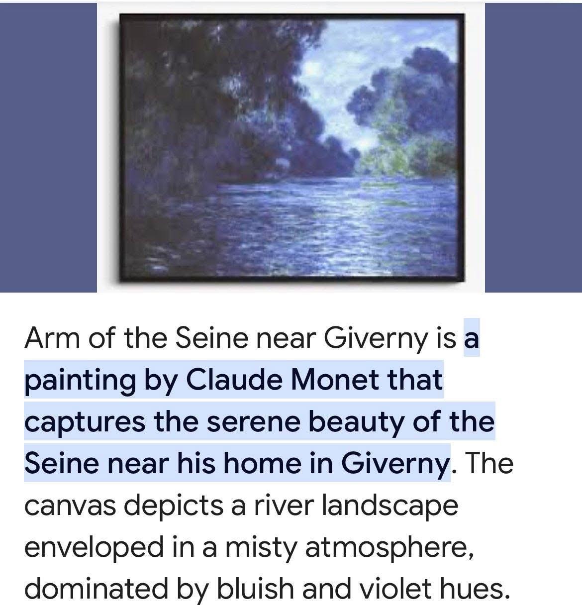 obraz Šimkovičovej však nie je slovenský a len slovenský ani trochu, ale akoby z rámu vypadol Monetovi (rameno Seiny v blízkosti Giverny) a na stránke je uvedené, že je namaľovaný technikou „kriedový kávový akryl“ (charcoal coffee acrylic), čo je pre fanúšikov umenia aj kunsthistorikov záhadou.