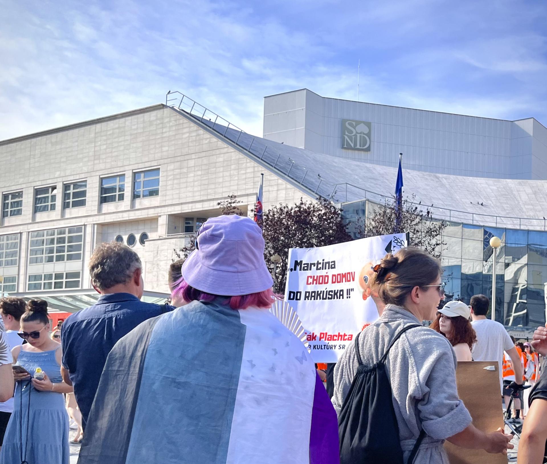 Na pódium medzi zástupcami a zástupkyňami študentstva z umeleckých škôl vystupuje aj Ráchel Rimarčíková, ktorá je poslucháčkou Divadelnej fakulty VŠMU. Po proteste sa spolu rozprávame o tom, ako sa iniciatíva zo strany študentstva vlastne sformovala. „Začalo to po odvolaní Alexandry Kusej, keď som sa pýtala, prečo ako študentstvo neprotestujeme. Bola som zarazená, že nám škola nedala žiadne vyjadrenie, že sa nikto neozýva. Veď študenti a študentky zvykli byť tí, čo organizovali protesty ako prví a prvé, najrýchlejšie sa vedeli zmobilizovať. Cítila som, že je potrebné niečo urobiť. Začali sme komunikovať so študentstvom VŠVU, vlastne ako dve školy, ktoré sú priamo napojené cez pedagogický zbor na inštitúcie SND a SNG. Kontaktovala som ľudí, v rámci kamarátov a kamarátok z VŠMU a VŠVU. Zháňala som niekoho z každej fakulty u nás, kto by bol ochotný alebo ochotná sa zapojiť, a to isté sa paralelne dialo na VŠVU. Potom sa k nám začali pridávať ďalšie školy, plánovali sme usporiadať študentský protest, ale v tom čase, keď sme ho začali pripravovať, vyšla von informácia, že bude opozičný utorkový protest. Zároveň s tým platforma Otvorená Kultúra! dala von informáciu, že taktiež pripravuje protest a bola ochotná spojiť sa so študenstvom. Neskôr sa rozhodli pripojiť viaceré združenia a organizácie, aby sme mali čo najväčší dosah. A už to išlo.“