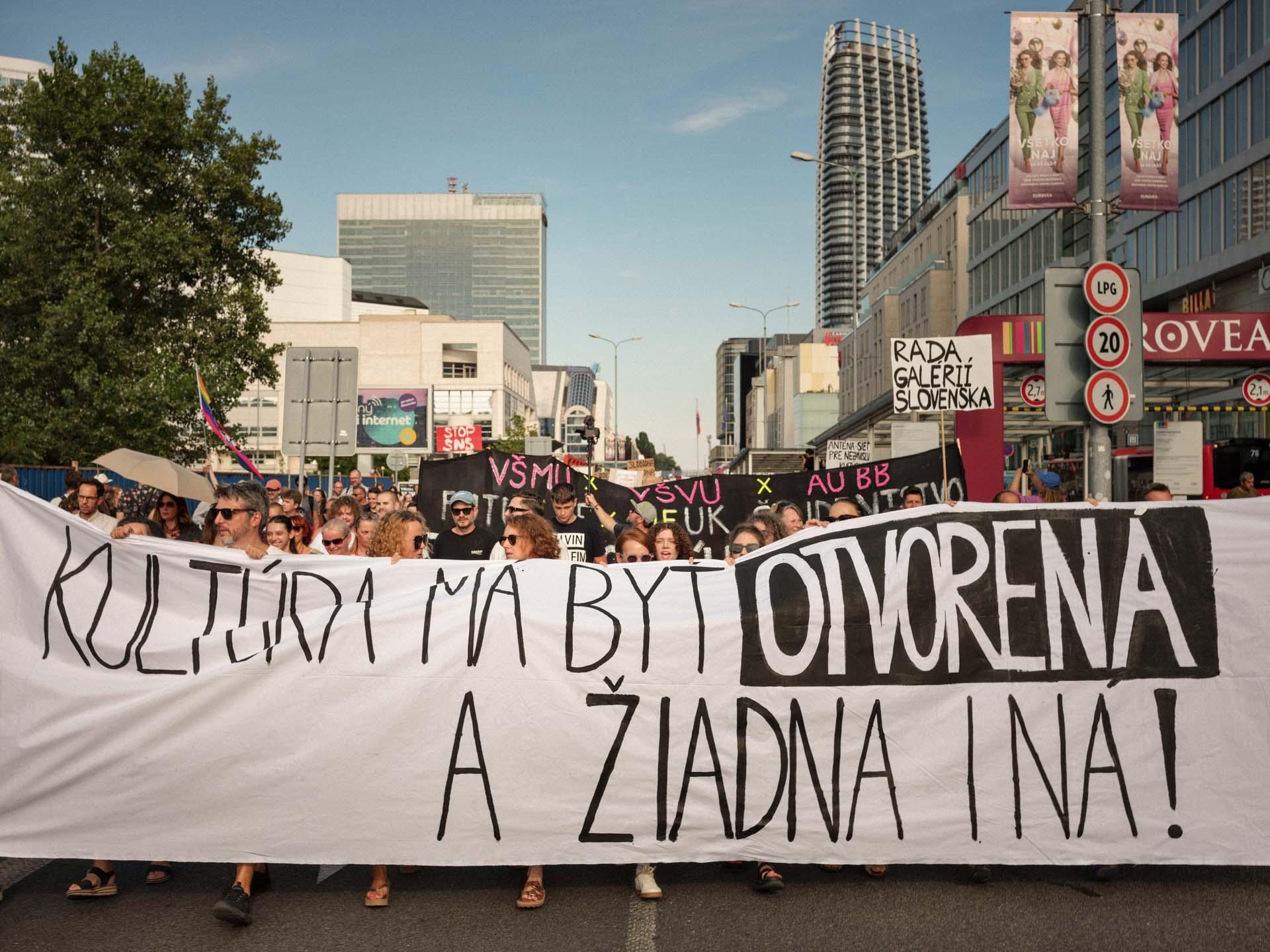V deň odvolania riaditeľky Slovenskej národnej galérie sa oznámili dva protesty. Pondelkový pochod a protest kultúrnej obce a utorkový, ktorý zvolali Progresívne Slovensko a Sloboda a Solidarita. Množstvo ľudí sa čudovalo tomu, prečo sa v reakcii na odvolanie Mateja Drličku a Alexandry Kusej konajú dve samostatné akcie. Nebolo by efektívnejšie, ak by sa boli spojili? „Medzi platformou OK! a ľuďmi z prostredia PS prebehla pred ohlásením protestov neformálna komunikácia, v ktorej sme za OK! artikulovali nestranícky charakter protestu,“ opisuje mi pozadie rozhodnutia nespojiť protesty Katarína Mišíková. „Z nášho pohľadu bolo jednoznačne správne demonštrovať jednotu kultúrnej obce, ktorá sa spája bez ohľadu na rôzne politické či ideologické preferencie. Protest zvolala kultúrna obec, ktorej sa ničivé dôsledky ministerstva kultúry priamo dotýkajú a ktorá chcela, aby v uliciach zaznel hlas občianskej spoločnosti aj hlas inštitúcií, jednotlivcov a jednotlivkýň, ktorí a ktoré chcú zostať nestranícki. Účasť na proteste nám potvrdila, že naše rozhodnutie nechať kultúru, aby hovorila sama za seba, bolo správne.“ Ráchel Rimarčíková na ňu nadväzuje: „Pre nás bolo podstatné, že Martina Šimkovičová mala na pondelok pozvánku, aby sa stretla so zástupcami a zástupkyňami kultúrnej obce. Ministerka pozvanie odmietla, no to sme v čase začiatku organizácie protestu ešte nevedeli, chceli sme sa s ňou stretnúť. Mali tam byť všetky organizácie a združenia, ktoré sa začali pripájať, všetko pod záštitou SND. Osobne vnímam toto jednorazové nespojenie sa aj ako moju reakciu na určitú mieru nečinnosti opozície. Vyvíjajú byrokratickú aktivitu, to im treba uznať, ale tá potreba je aj v uliciach. Nezvolávali dostatočne občiansku spoločnosť, ktorá ale očividne pripravená bola. Protest po pol roku? Už mesiac po poslednom bolo, prečo ísť do ulíc.“