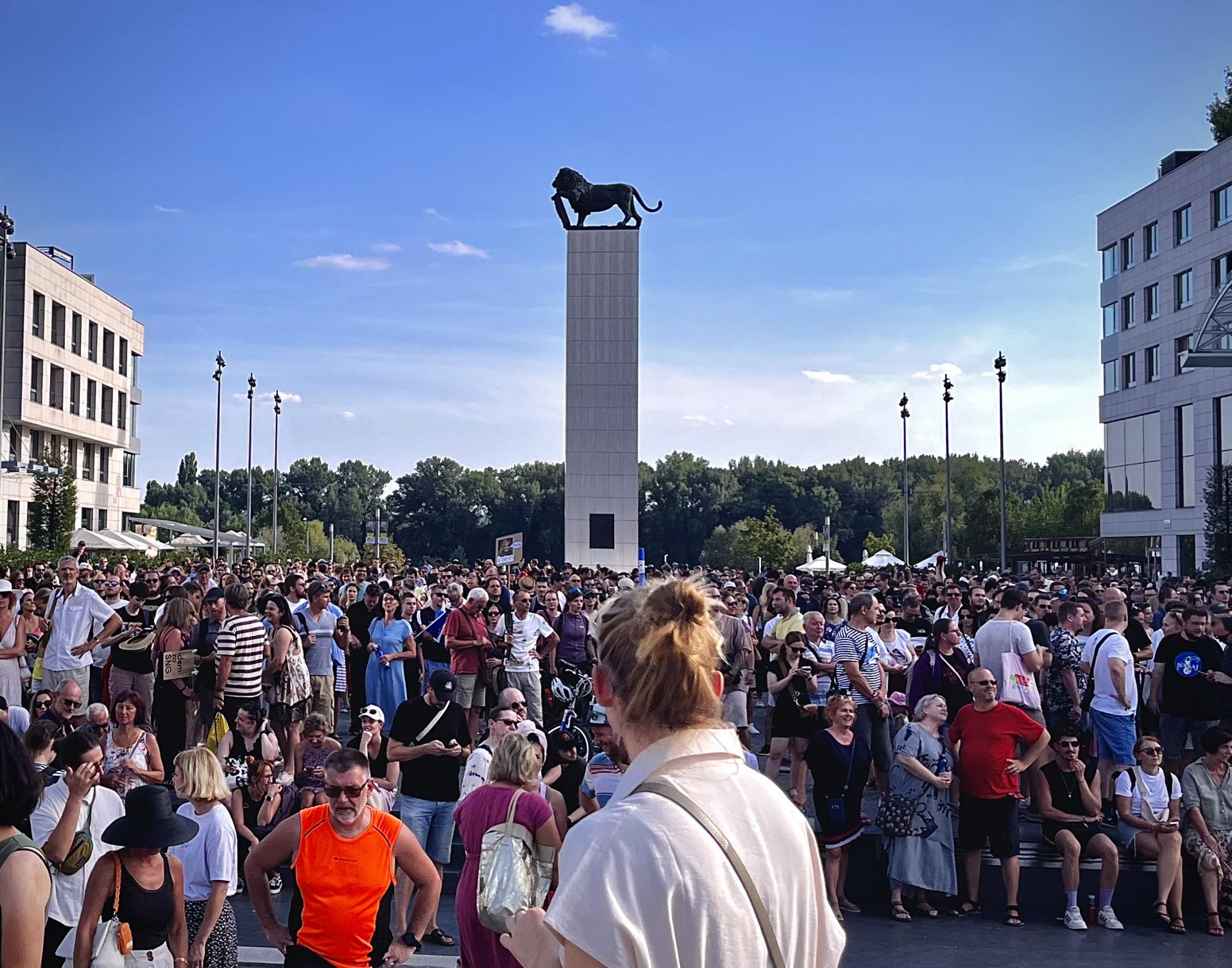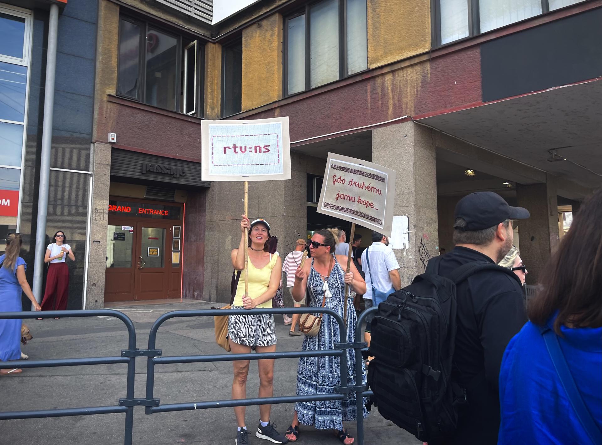 Medzi najsilnejšie momenty protestu nepochybne patria záverečné vystúpenia. Herečka Zuzana Kronerová číta výzvu „Je čas podat ruku!“, ktorá vznikla v Česku na znak solidarity so slovenskou kultúrnou obcou. Znejú slová podpory smerované nám, ale aj prosba o to, aby českí predstavitelia kultúry a umenia stáli pri nás, toto je čas pomôcť a napnúť záchranné siete. Podpísané sú samé zvučné mená, znie nadšené pískanie, ľudia tlieskajú bez prestávky. Niekto vidí, aký boj tu zvádzame, nie sme v tom osamelí, a tento pocit rezonuje celým námestím. V oranžových vestách sa cez dav predierajú dobrovoľníci, roznášajú vodu a poháre, pristavujú sa pri ľuďoch, uisťujú sa, či sa niekto necíti v tej horúčave zle. Protest vrcholí, Jakub Jablonský a Adam Dragun z kapely Berlin Manson čítajú zoznam kultúrnych organizácií, ktoré sa pridali k protestu. Už to nie je len bratislavské Námestie SNP, je to Banská Bystrica, Košice, Nitra, Trnava, Bardejov, Žilina, Spišská Nová Ves, Prešov či Banská Štiavnica. Je to nezriaďovaná kultúra zo všetkých kútov Slovenska, asociácie, divadlá, spolky, kultúrne centrá. Potlesk je hlasnejší a hlasnejší až je neprerušovaný.