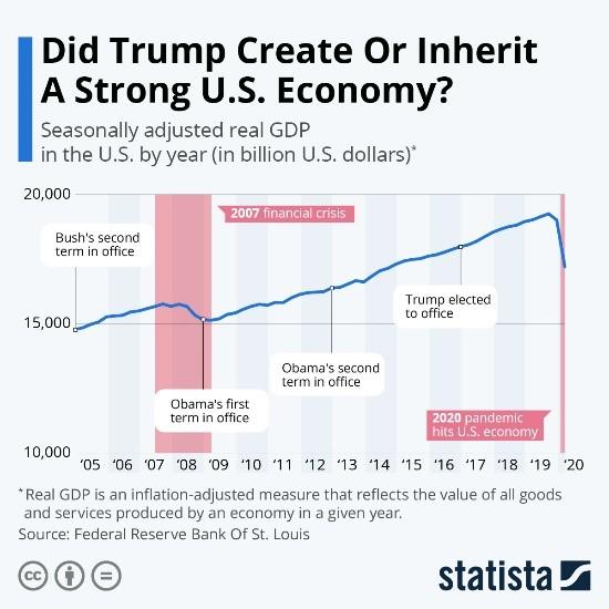 V médiách rezonuje ako hlavný dôvod Trumpovej výhry ekonomická situácia. Kým za éry Donalda Trumpa sa ekonomike v USA darilo, za Bidena stúpala inflácia. Ale zhodnotenie situácie je len prvý krok. Rast HDP aj pokles nezamestnanosti boli za Trumpa pôsobivé, to je pravda. Ale keď spravíme dva kroky vzad a pozrieme sa na grafy hrubého domáceho produktu a nezamestnanosti ešte od éry predošlého prezidenta, zistíme, že Trump sa len vozil na trendoch, ktoré nastavil Barack Obama.