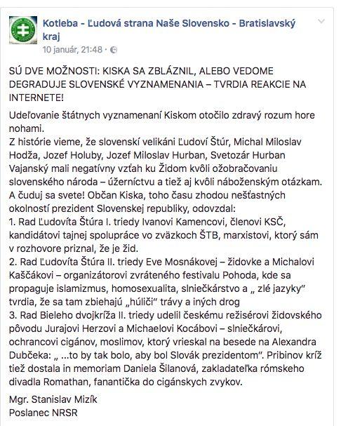 Útokom na štyroch vzácnych ľudí (a ďalších), ktorých prezident Andrej Kiska po Novom roku ocenil, poslanec Mizík prekonal všetky mysliteľné hranice tolerancie (v duchu slobody prejavu) a tiež elementárnej slušnosti. Ak nám nestačili všetky hrôzy, ktoré kotlebovci v uplynulej dobe (najmä) na sociálnych sieťach zverejnili, ak nám nestačia všetky tie neslávne známe výroky Mazureka, tak hovorím, že naše pokračujúce mlčanie a apatia spôsobia ešte väčší nárast extrémizmu.