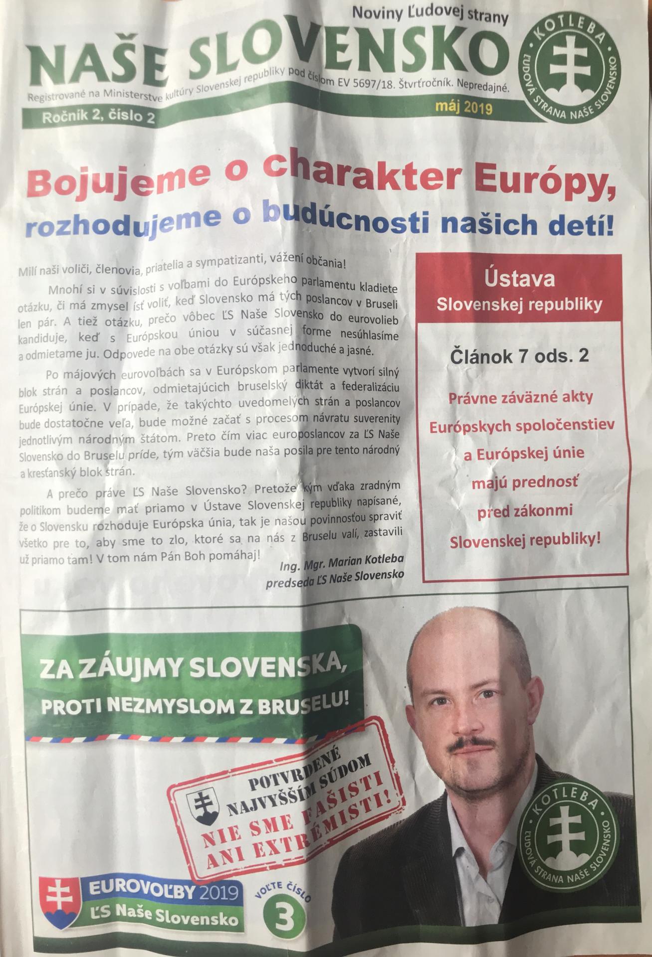 Pod úvodným textom titulky novín ukázal Marián Kotleba svoje najsilnejšie eso. Rozhodnutie súdu o nezrušení ĽS NS vytlačené v tvare pečate s klamlivým nápisom „Potvrdené najvyšším súdom – Nie sme fašisti ani extrémisti!“. Úlohou Najvyššieho súdu nebolo, samozrejme, rozhodovať o tom, či je ĽS NS fašistickou stranou, ale rozhodnúť o dôkazoch predložených generálnym prokurátorom.