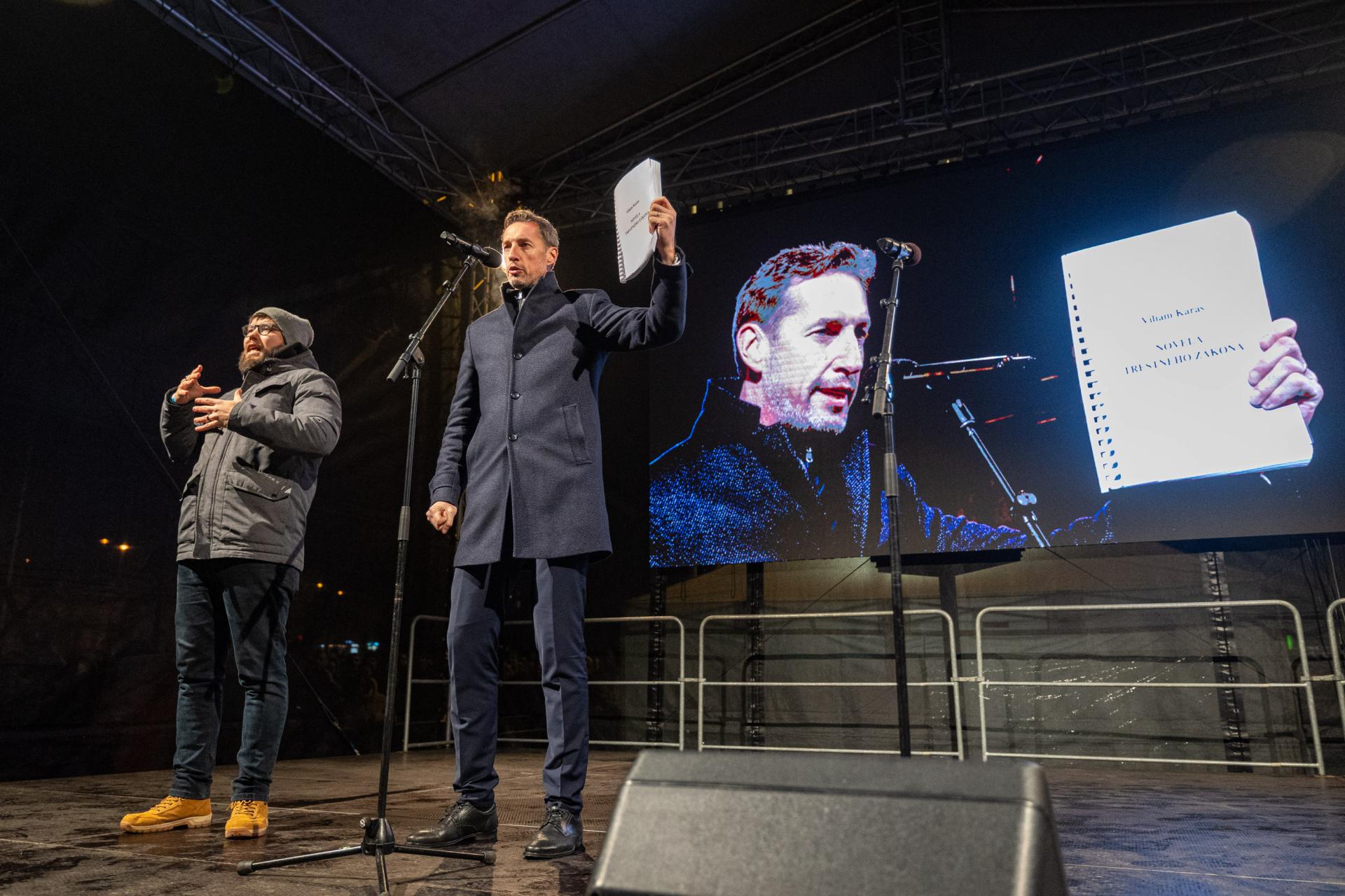 Posledným rečníkom večera bol predseda PS a podpredseda parlamentu Michal Šimečka. Ohlásil, že na proteste v Bratislave sa nachádza 26-tisíc účastníkov. Podotkol, že majú byť na čo hrdí a dosiaľ veľa dosiahli. „Robert Fico doteraz nepretlačil svoj promafiánsky balíček. Už je nervózny a vyhráža sa. Peter Pellegrini zase cúva a ponúka ústupky,“ vyhlásil Šimečka. Dodal, že odpor nečakali, zdôraznil, že účastníci protestu sa dokázali zjednotiť. Pripomenul tiež, že našli i spojencov v podobe niekoľkých stoviek poslancov Európskeho parlamentu (Európsky parlament hlasoval o uznesení, v ktorom vyjadrili obavy zo zmien v Trestnom zákone z dielne súčasnej slovenskej koalície, podporilo ho 496 zo 630 prítomných poslancov - pozn. SITA). Šimečka upozornil na riziko straty eurofondov pre Slovensko. „Pán Fico, brzdite!,“ vyzval šéf progresívcov. „Ste opitý mocou. A preto brzdite. Lebo narazíte. A nielen do stĺpa,“ adresoval slová Ficovi. Pripomenul i Dankovu autonehodu a poukázal na to, že Danko po nehode fúkal po 15 hodinách. Vláda podľa neho ničí všetko, čo začínalo fungovať, spomenul spravodlivosť, ochranu prírody či kultúru. Zdôraznil, že musia vydržať a ešte väčšmi na nich zatlačiť, v parlamente i na uliciach. Predseda PS pripomenul i blížiace sa prezidentské voľby a voľby do europarlamentu. Viacerí zhromaždení kričali „Korčok na hrad!“. „Krok za krokom si Slovensko vezmeme späť! Teraz, nabudúce, v každých ďalších voľbách,“ zakončil Šimečka.