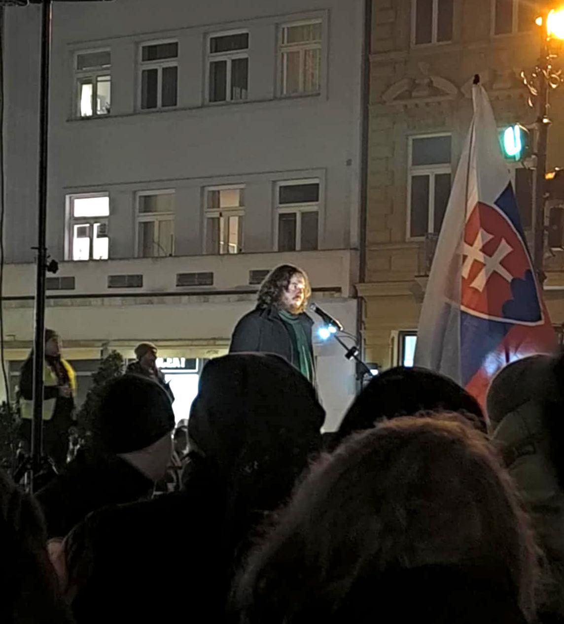Potom udrelo 18.00, postavil som sa ku mikrofónu a zistil som, že periféria zhromaždených končí až pri Slovane, ľudia stoja v bočných uličkách, okolo pódia a ešte aj za ním. A ja som mal teraz tento dav inštruovať k pochodu po meste a k obozretnosti voči provokatérom.