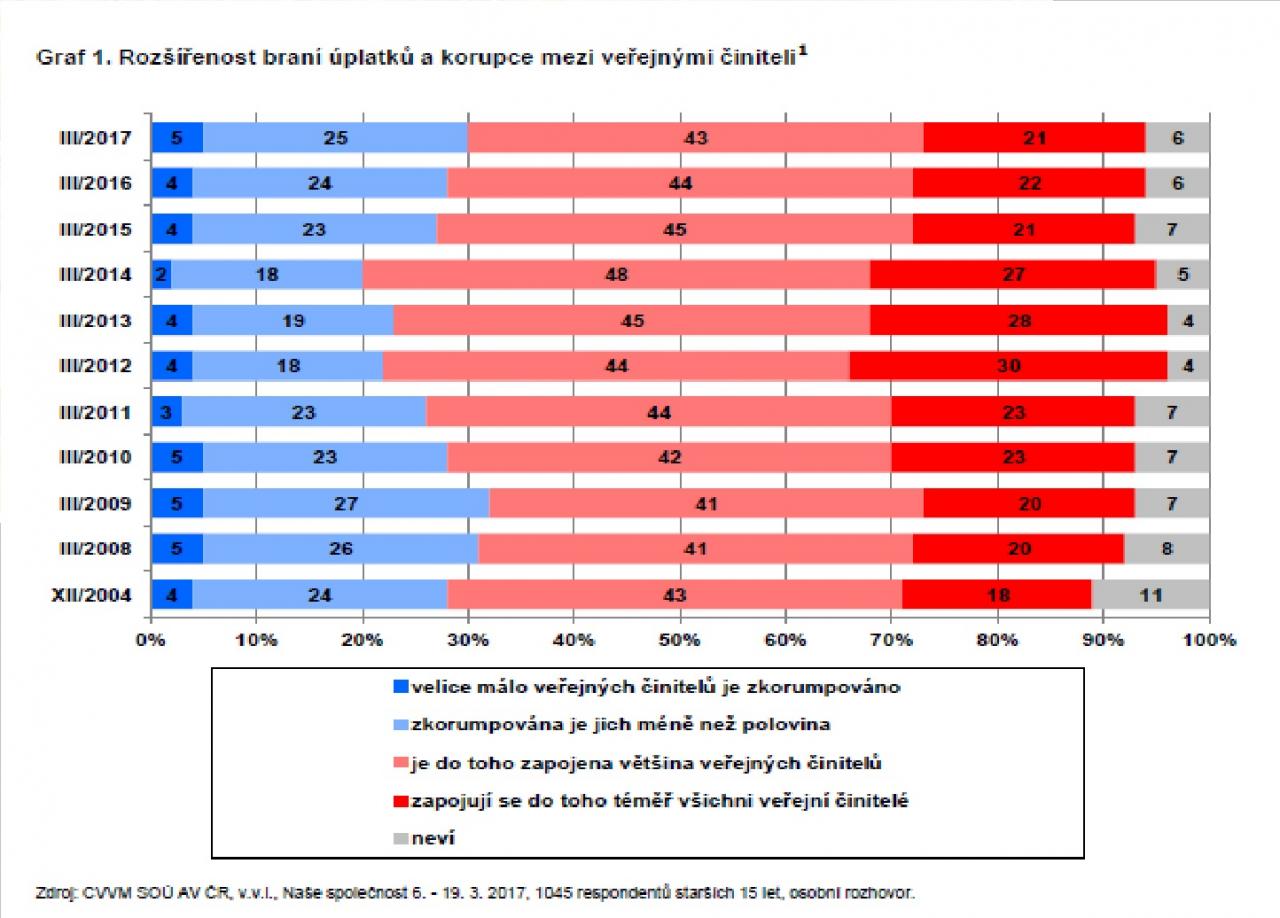 „Pouze 5 procent respondentů se domnívá, že velice málo veřejných činitelů je zkorumpováno. O zapojení téměř všech těchto činitelů do korupce je přesvědčeno 21 procent dotázaných. Srovnání s výsledky z minulých šetření ukazuje, že česká veřejnost je k míře korupce dlouhodobě skeptická.“