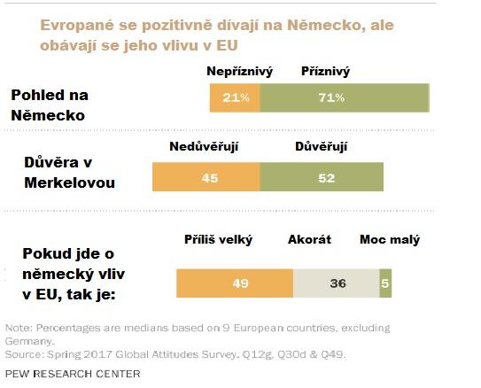 Zhruba sedm z deseti Evropanů mimo Německo vidí tuto zemi příznivě a asi polovina důvěřuje Merkelové, že dělá v zahraniční politice správné věci. Ale mnozí Evropané si myslí, že Německo má příliš velký vliv, pokud jde o rozhodování v EU.