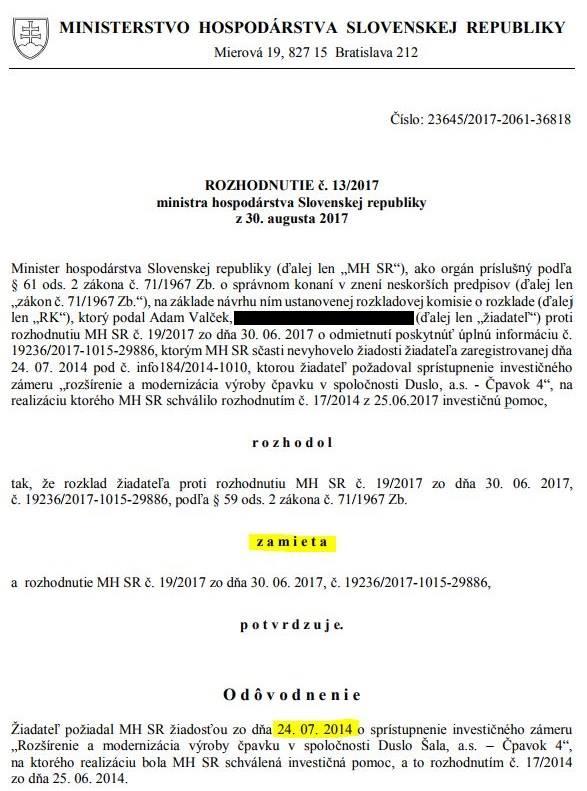 Podrobnosti o státní pomoci Babišově firmě resort dál tají – už před soudem se totiž hájilo tím, že jde o obchodní tajemství. Valček žádal o zpřístupnění investičního záměru Dusla, který je součástí žádosti o dotace a ve kterém jsou podrobnosti o dotovaném podnikání. Ministr Pavol Pavlis nejprve rozhodl, že se dokument zpřístupní, ale důležité informace vybělí. „Vybělili například to, jak vypočítali, že Duslo má nárok na 58 milionů eur,“ vysvětlil v roce 2016 Valček.