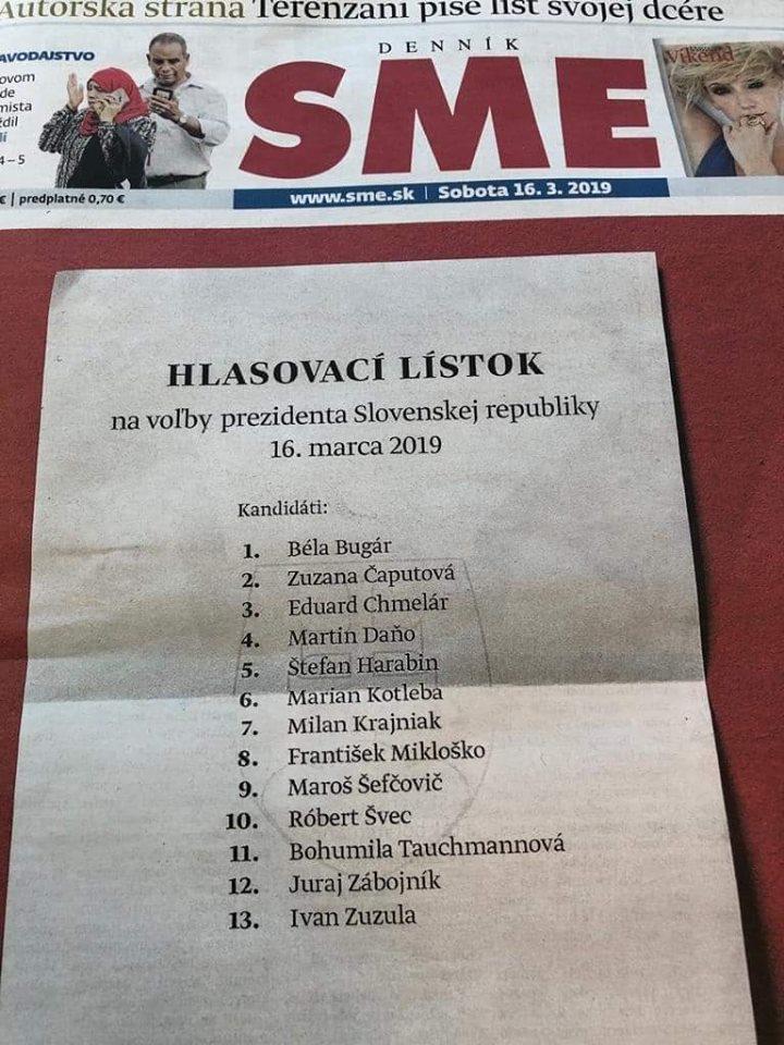 denník SME na titulnej fotografii uverejnil fiktívny volebný hlasovací lístok. Poradie kandidátov na ňom však nebolo úplne presné – neboli na ňom totiž dvaja kandidáti, ktorí sa pred prvým kolom vzdali.