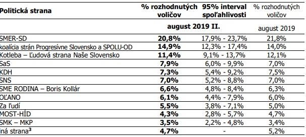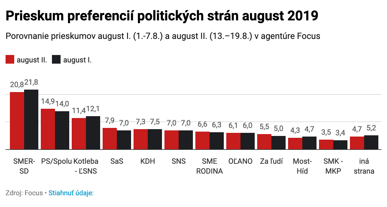 nová strana Andreja Kisku Za ľudí je na hrane zvoliteľnosti. Podľa agentúry Focus by ho volilo 5,5 % opýtaných. Prieskum sa uskutočnil v dňoch 13. – 19. augusta.