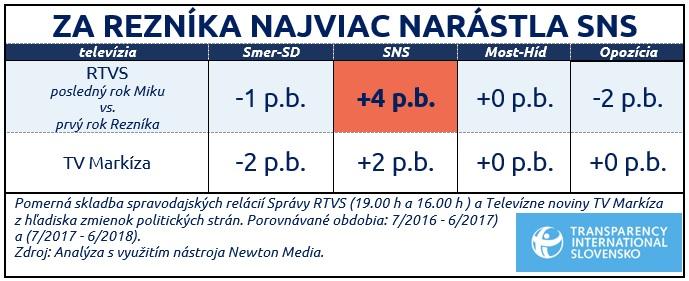 Iné strany sa takejto rastúcej pozornosti nedočkali: Smer-SD poklesol v Správach RTVS o 1 percentuálny bod, Most-Híd stagnoval a opozícia dokopy stratila 2 percentuálne body. Väčšia viditeľnosť strany, ktorej šéf obsadil druhú najvyššiu ústavnú funkciu, a ktorá mala už aj prvé kauzy, je logický. Že však RTVS udeľovala národniarom neprimerane veľký priestor, naznačuje aj porovnanie s Markízou, v ktorej spravodajstve SNS medziročne zaznamenala iba polovičný nárast (2 percentuálne body).