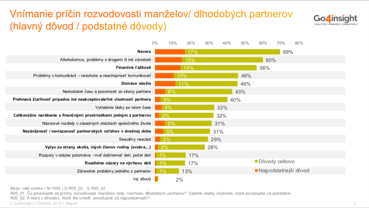 Z výsledkov prieskumu vyplýva, že Slováci považujú za najčastejšie príčiny rozvodov neveru (69 %), alkoholizmus a problémy s drogami (60 %) či finančné ťažkosti (56 %). Druhú trojicu príčin kopírovali vzťahové problémy ako domáce násilie, neochota komunikovať a nedostatok času a pozornosti zo strany partnera.
