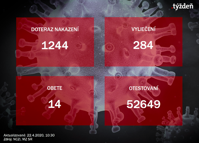 • na Slovensku je aktuálne 1244 (+45)  potvrdených prípadov ochorenia COVID-19, 284 (+36) ľudí sa z choroby vyliečilo, 14 (+0) na jej následky zomrelo, na JIS je aktuálne 8 pacientov, dvaja sú na pľúcnej ventilácii,