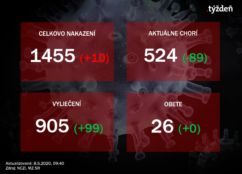 - na Slovensku je aktuálne na ochorenie COVID-19 potvrdených 1455 (+10) prípadov, 905 (+99) ľudí sa z choroby vyliečilo, 26 (+0) na jej následky zomrelo, počet hospitalizovaných pacientov je 122 (+0)