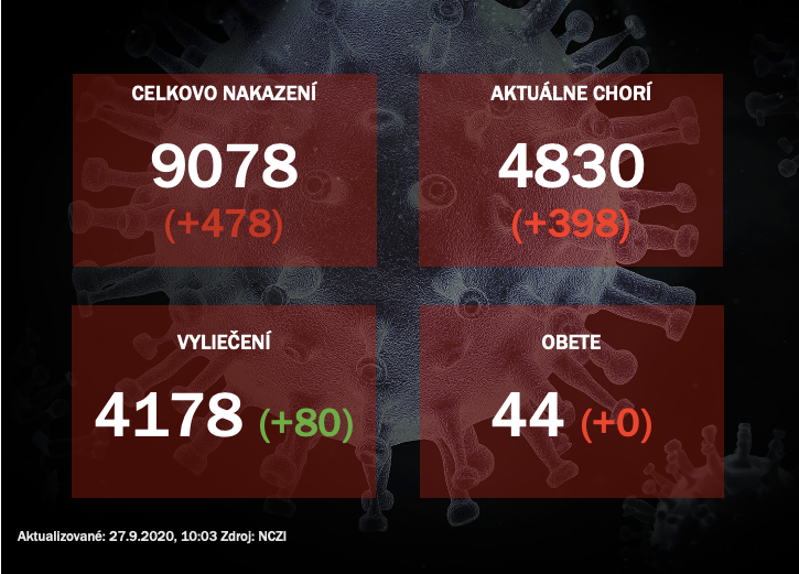 na Slovensku v sobotu (26. 9.) pribudlo 478 infikovaných koronavírusom SARS-CoV-2. Celkový počet pozitívne testovaných sa zvýšil na 9078.