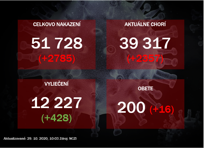 na Slovensku v stredu (28. 10.) pribudlo 2785 nakazených novým koronavírusom zo 14 355 testov. Pribudlo 16 nových úmrtí. Z ochorenia sa za stredu vyliečilo ďalších 428 ľudí. Informuje o tom Národné centrum zdravotníckych informácií na webovej stránke covid-19.nczisk.sk.