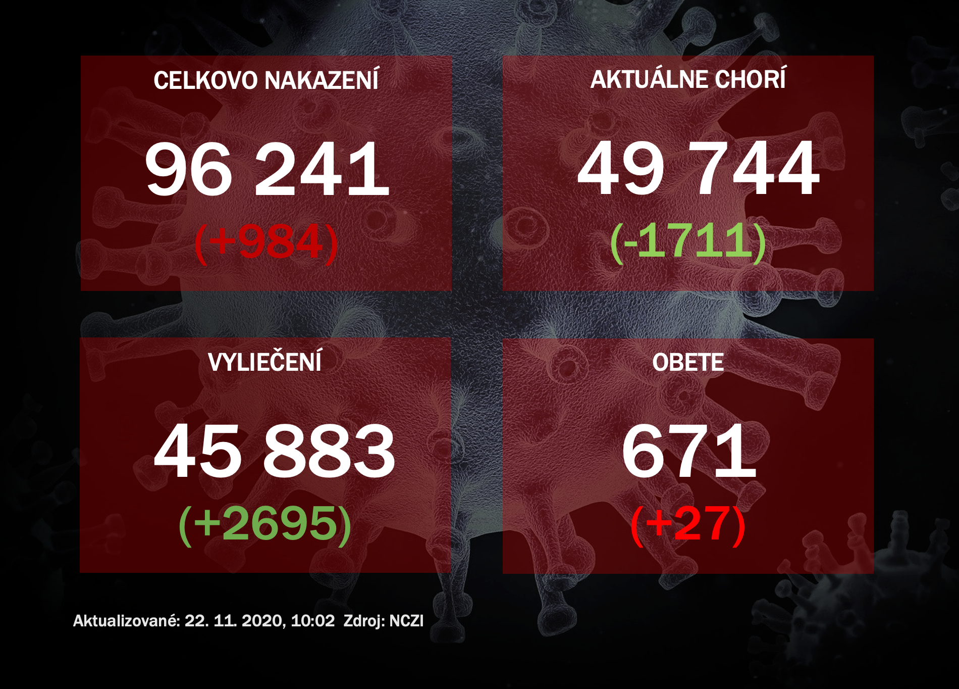 - na Slovensku je aktuálne na ochorenie COVID-19 potvrdených 96 241 (+984) prípadov, 45 883 (+2695) ľudí sa z choroby vyliečilo, 671 (+27) na jej následky zomrelo,