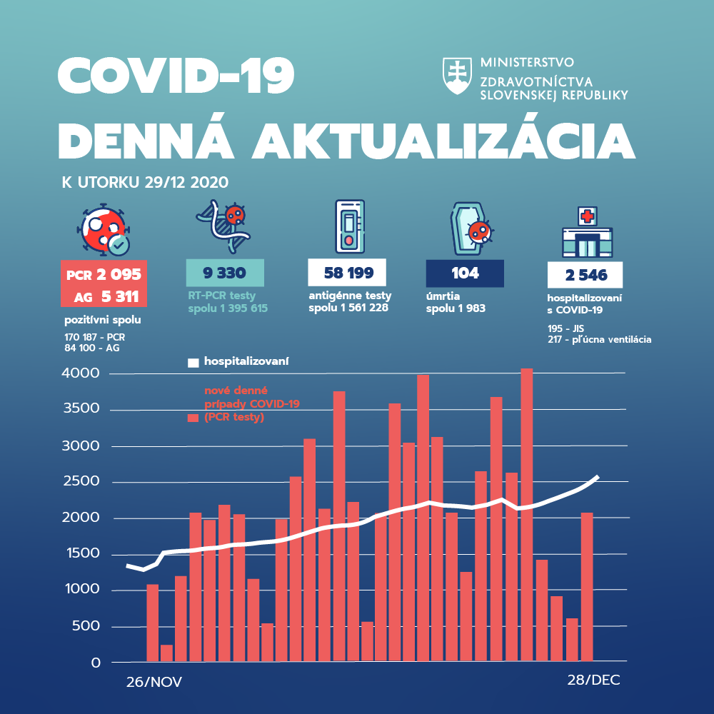 - na Slovensku je aktuálne na ochorenie COVID-19 potvrdených 170 187 (+2095) prípadov, 121 760 (+1350) ľudí sa z choroby vyliečilo, 1 983 (+104) na jej následky zomrelo,