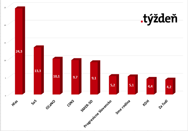 strana expremiéra Petra Pellegriniho Hlas-SD aj naďalej rastie. Podľa aktuálneho prieskumu agentúry Focus pre reláciu Na telo Michala Kovačiča, by ju volilo 24,3 percenta. Ešte v decembri by ju volilo skoro 21 percent voličov.