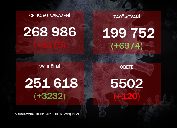 10:01 SLOVENSKO: Na Slovensku v utorok (9. 2.) pribudlo 3179 nakazených novým koronavírusom, ich doterajší celkový počet stúpol na 268 986. Pozitívne vzorky odhalili z 13 980 PCR testov, ktoré sa v utorok urobili.