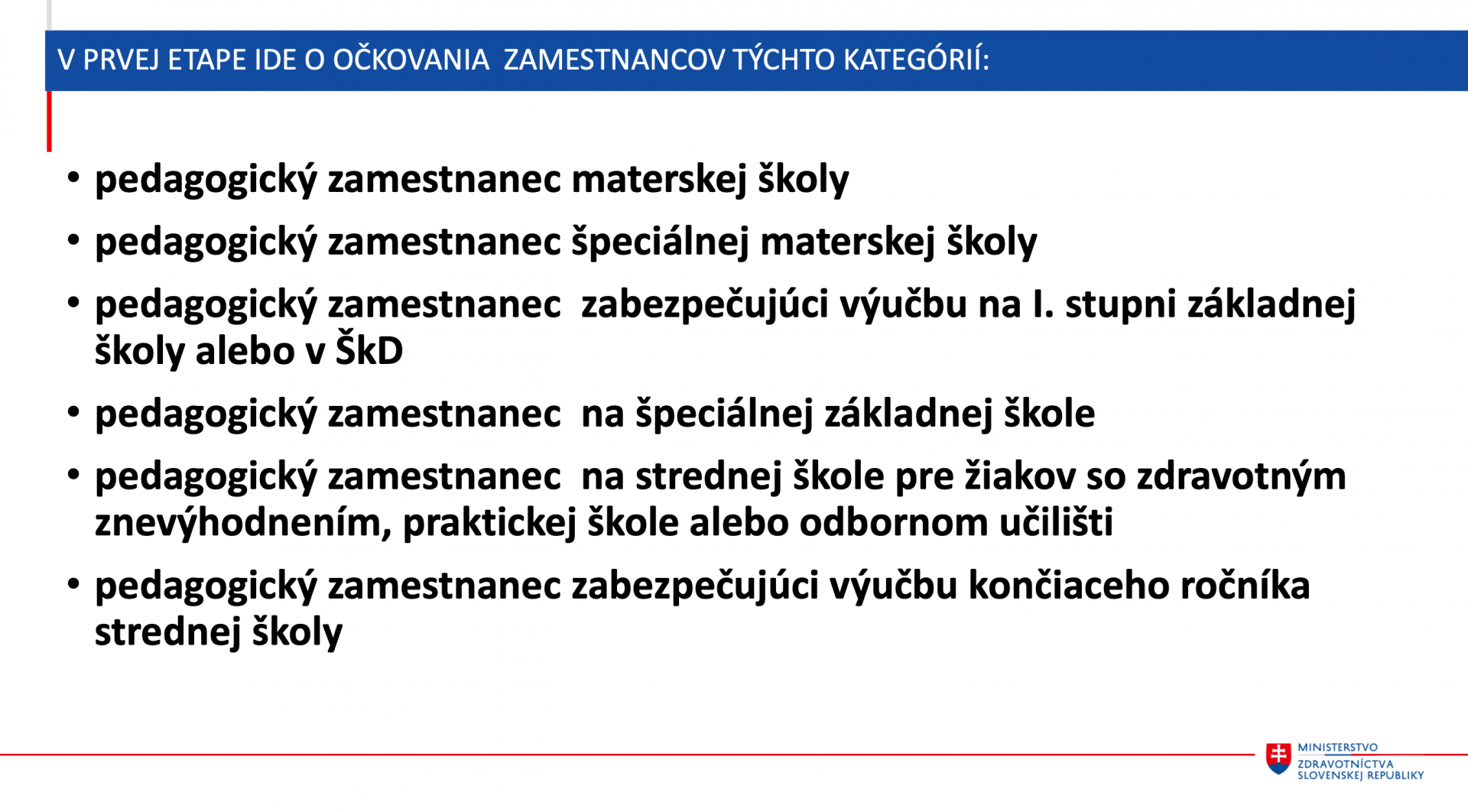 Cez víkend sa začne s očkovaním pedagogických zamestnancov do 55 rokov vakcínou od AstraZeneca. Následne od pondelka (15. 2.) sa budú vakcinovať pedagogickí zamestnanci nad 55 rokov, prihlasovanie sa spustí nasledujúce dni.