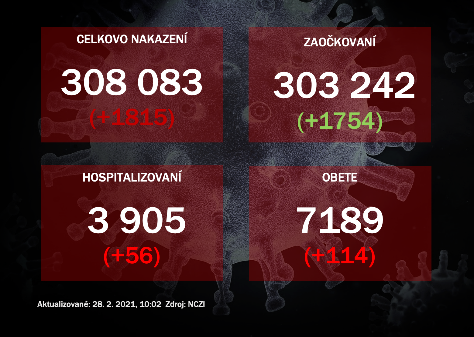 - na Slovensku je aktuálne na ochorenie covid-19 potvrdených 308 083 (+1815) prípadov, a 7 189 (+114) na jej následky zomrelo,