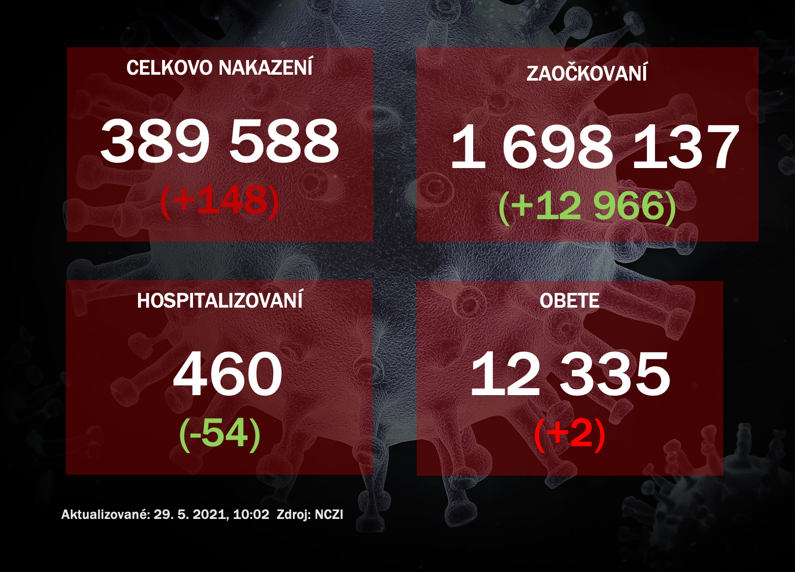 prostredníctvom 5589 vykonaných RT-PCR testov odhalili v piatok (28. 5.) na Slovensku 148 prípadov nového koronavírusu. Pribudli dve obete. Informuje o tom Národné centrum zdravotníckych informácií na webovej stránke covid-19.nczisk.sk.