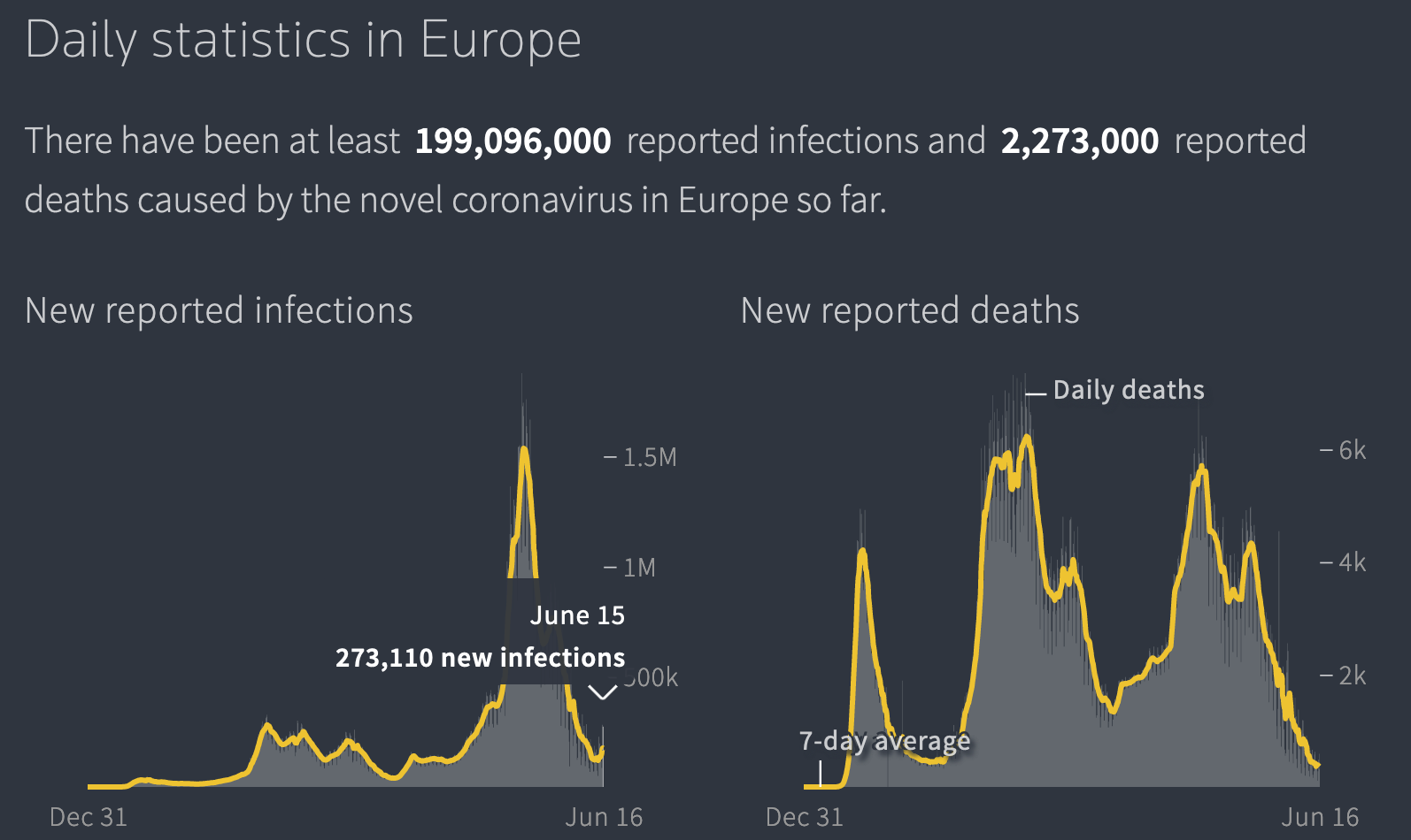 Začiatkom júna mala Európa (s Ruskom) pri 750 miliónoch prípadov asi 750 tisíc pozitívnych za týždeň. Od začiatku júna Európa rastie, pričom predminulý týždeň bolo pozitívnych 1 milión a za posledných 7 dní je to 1,25 milióna. Rast je 25%.