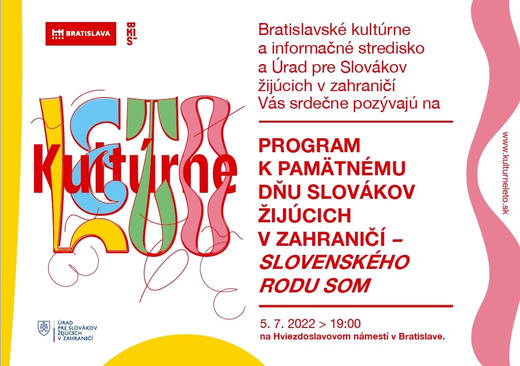 Po dvoch pandemických rokoch sa vracia aj večerný kultúrny program krajanských umelcov v centre Bratislavy, tentoraz s názvom Slovenského rodu som. V Átriu na Hviezdoslavovom námestí od 19. hodiny vystúpia slovenskí folkloristi z Maďarska, Rumunska, Chorvátska, Rakúska, Detský folklórny súbor Sovička z Londýna i interpreti populárnych piesní slovenského pôvodu a operná speváčka Katarína Kalmárová zo Srbska. Program vznikol v spolupráci s Bratislavským kultúrnym a informačným strediskom a je súčasťou Bratislavského kultúrneho leta 2022.